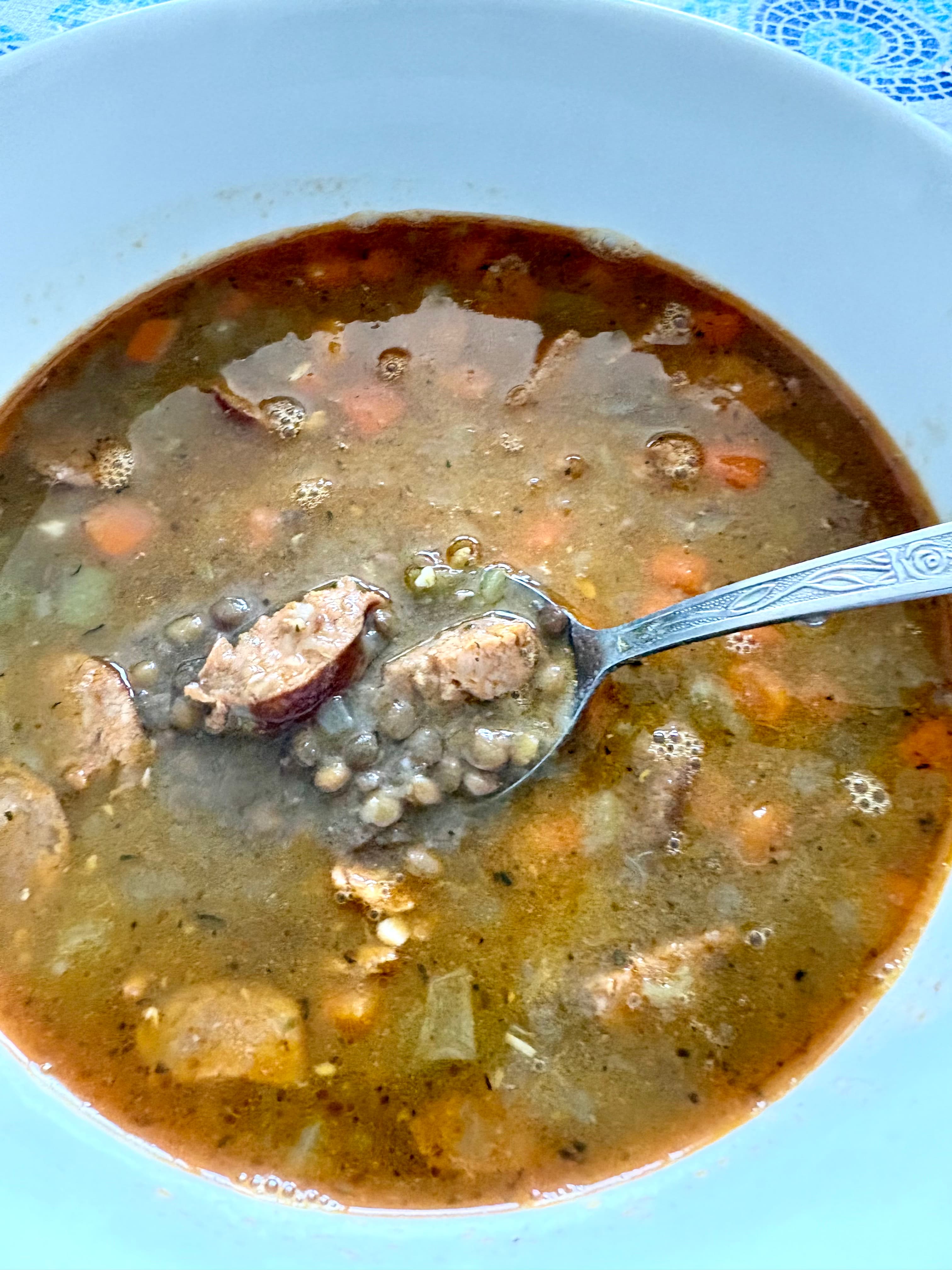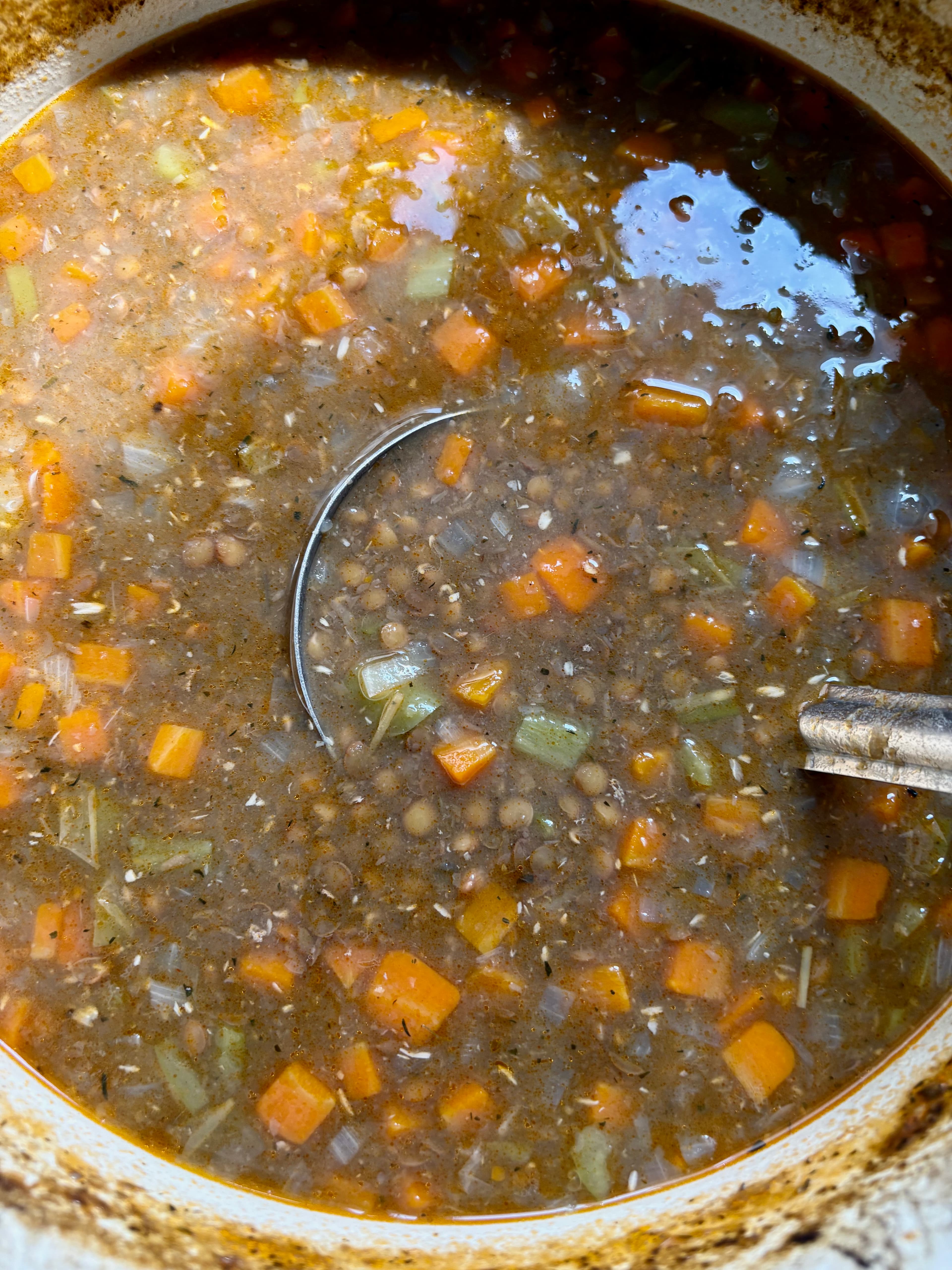 The days are sunny and warm, but evenings cool, so I made a big ol’ pot of lentil soup yesterday for the cooler days ahead.