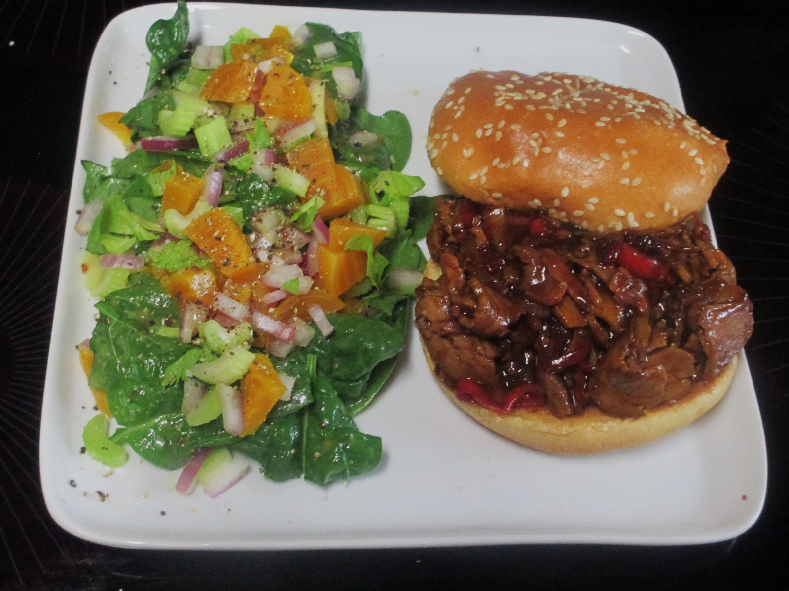 Thinly sliced left over pork tenderloin, sauteed with onions and peppers, added a splash of beer and bbq sauce, served on a toasted brioche sesame bun. Spinach, red onion, celery, roasted golden beet salad, honey mustard dressing.