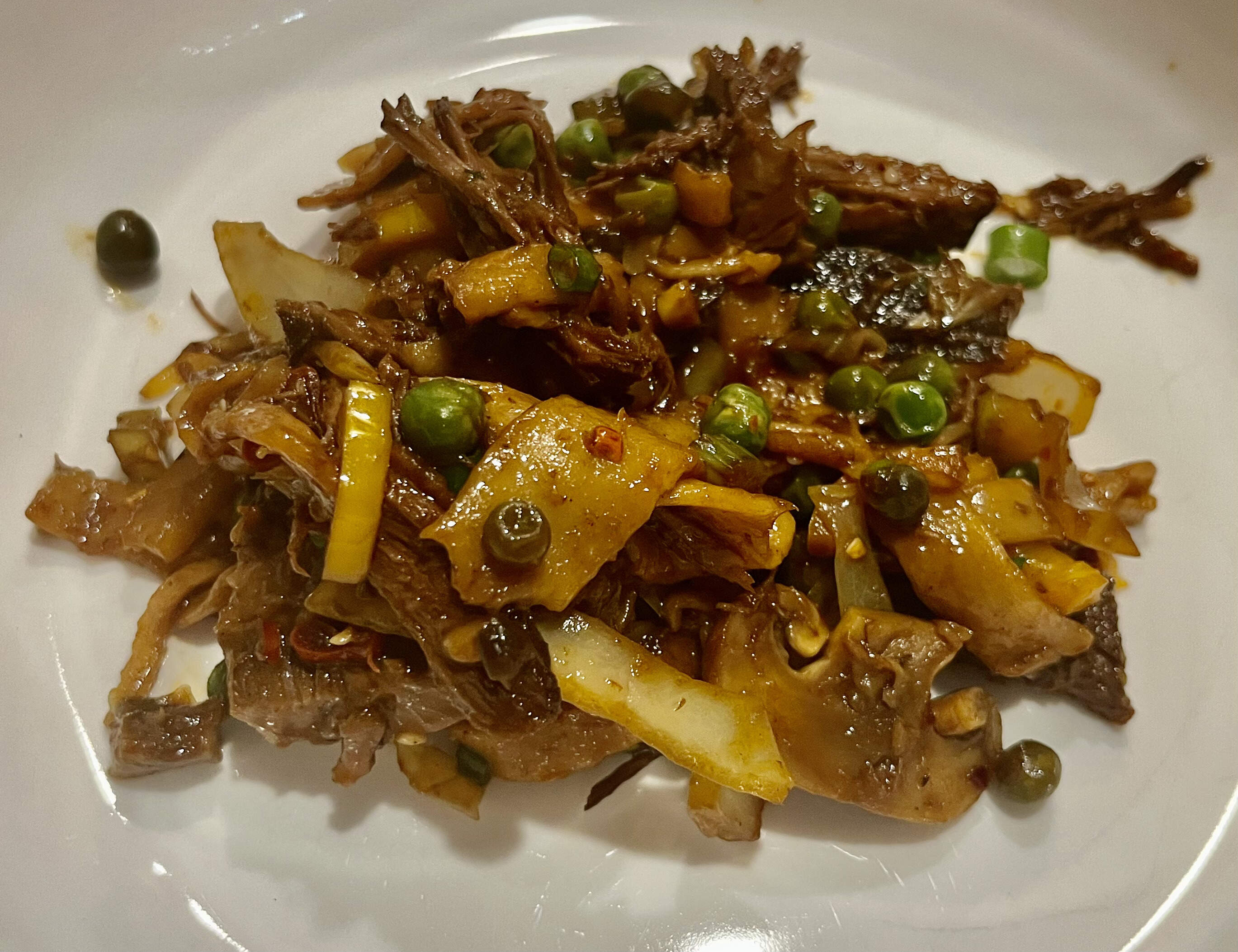 Dinner was leftover hand-cut noodz with fatty beef from Wednesday & red wine braised short rib from Thursday that I mixed up with stir-fried veg (onion, celery, a 5th of green & sweet pepper) from the crisper that needed to go, plus the last of a bag of frozen green peas.