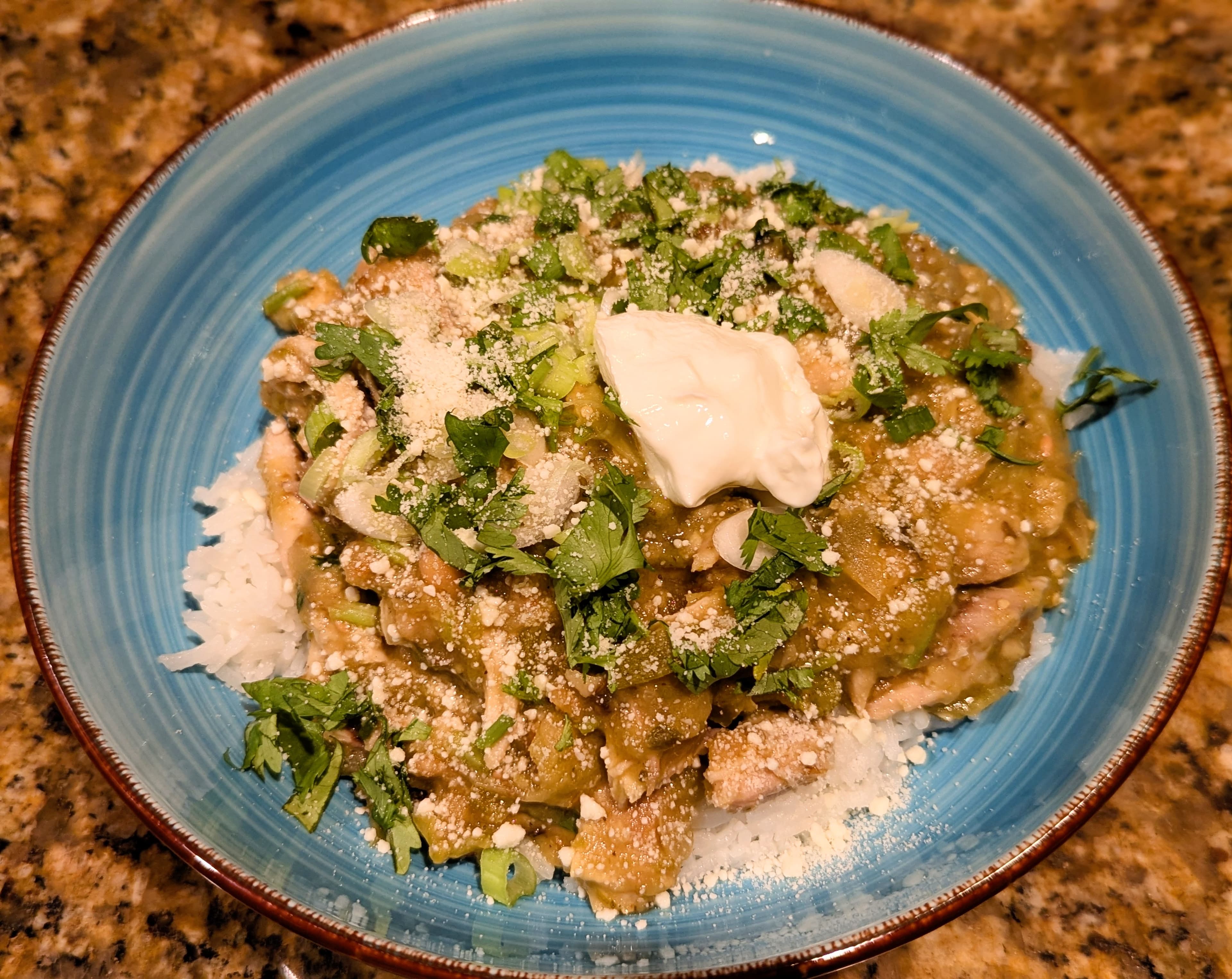 Chicken And White Bean Chile Verde with all the fixings. The base is Anaheim and serrano chiles, tomatillos, white onion, and a head of garlic.