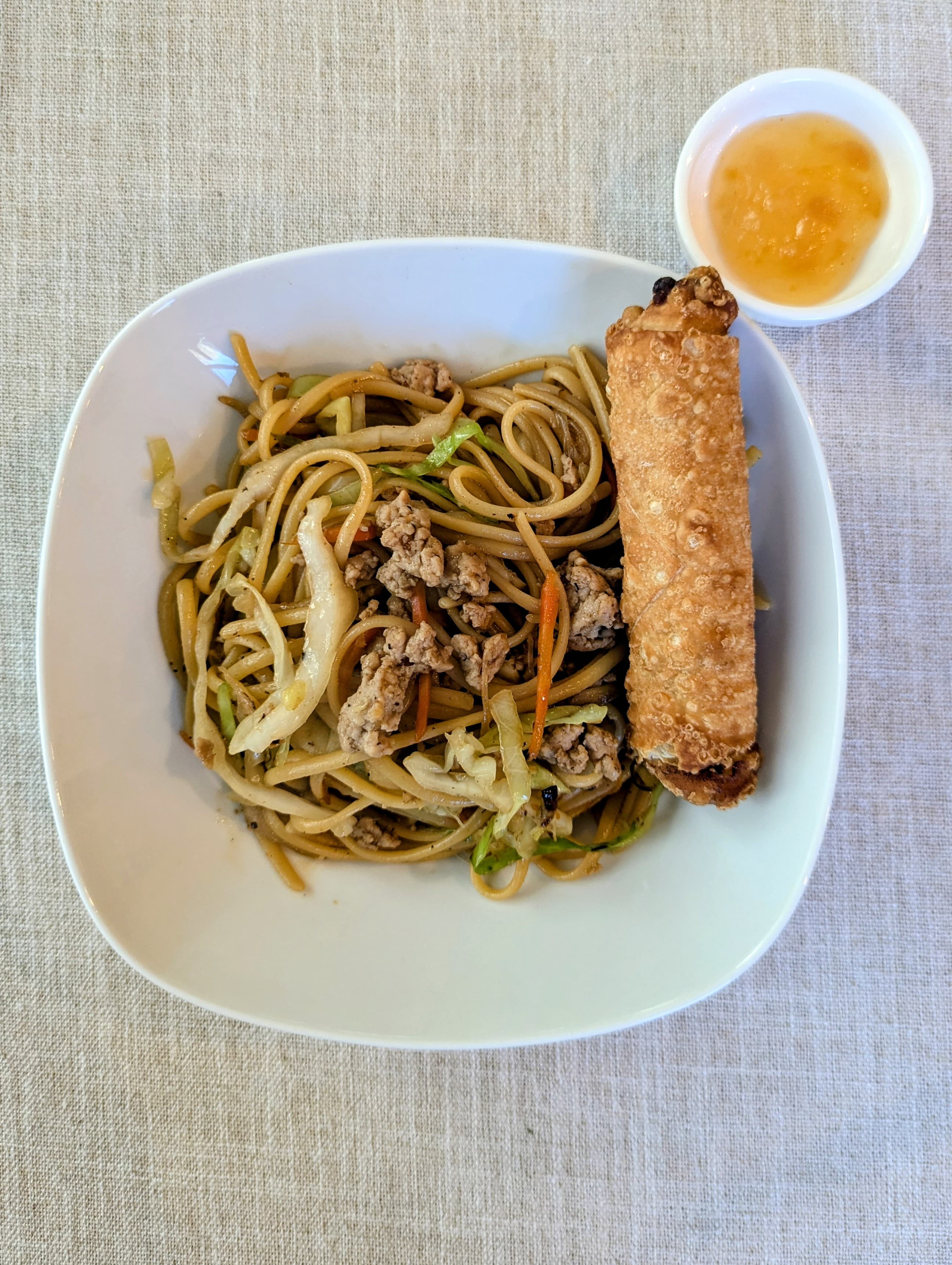 I copied @LindaWhit and made my own take on ground chicken and cabbage lo mein with carrots, yellow onion, scallion, garlic, and ginger. Served up with Aldi egg pork rolls and leftover buttered broccolini tossed with sweet soy and black vinegar.