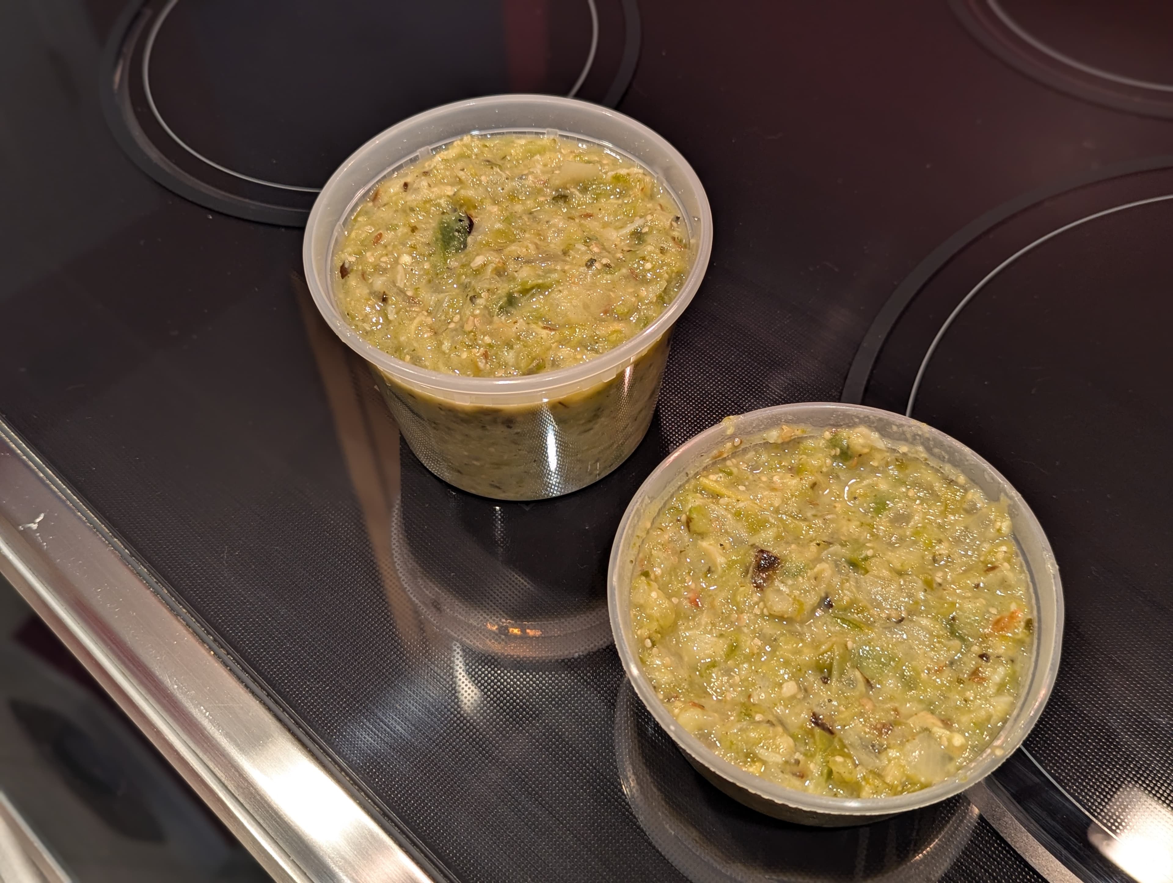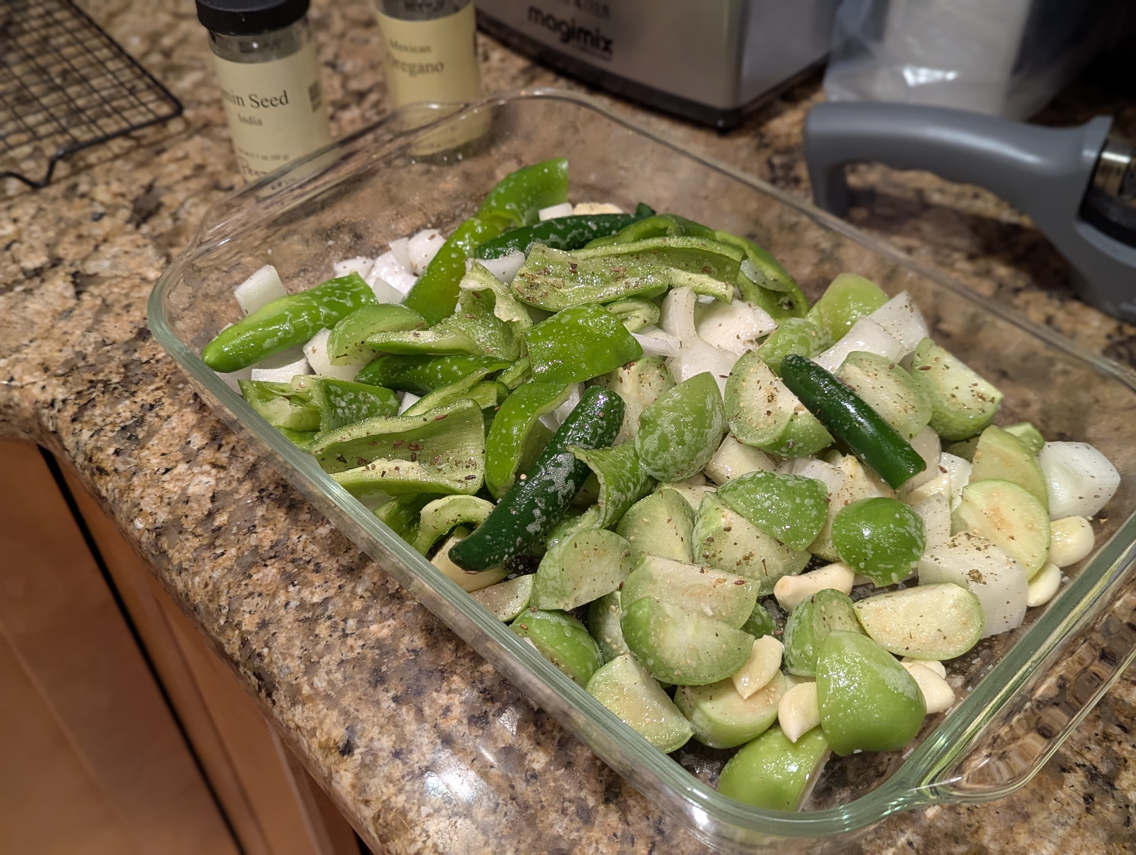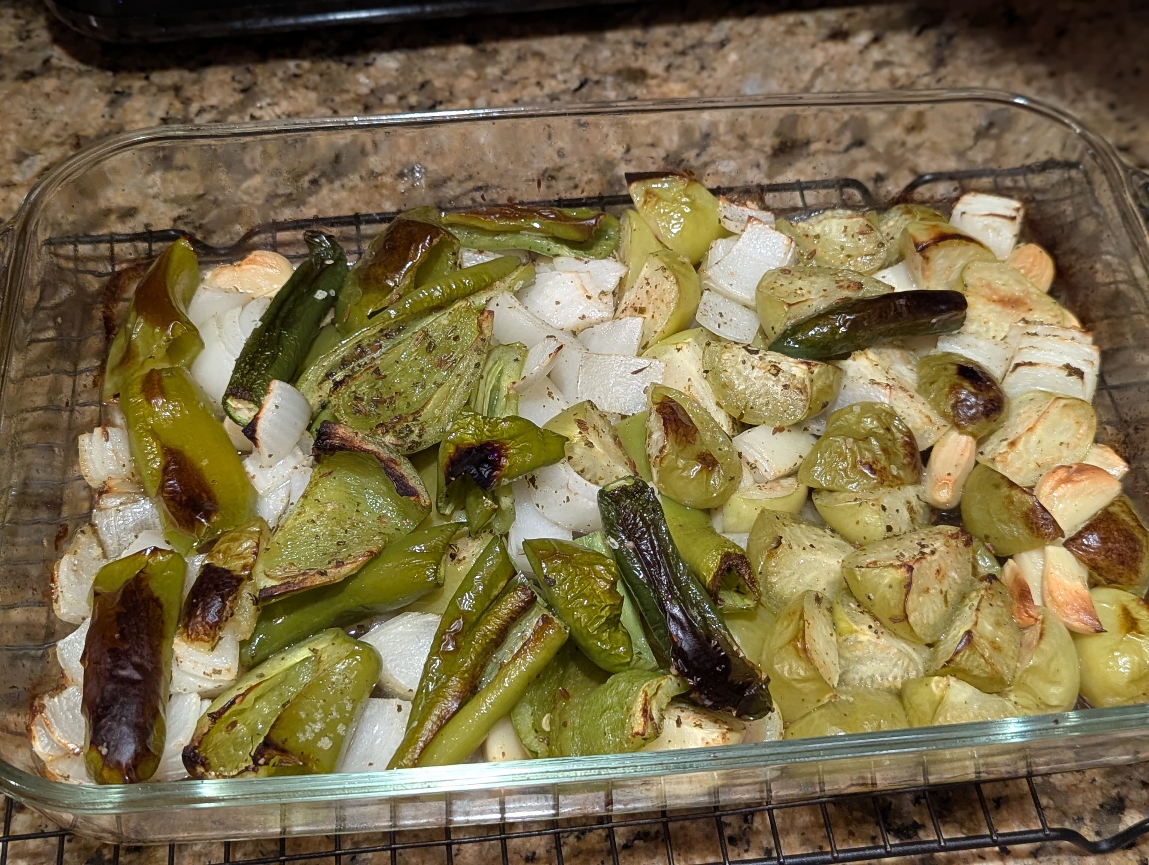 Winged it. 4 Anaheims, 3 serranos, 10 tomatillos, 1 white onion, a head of garlic, cumin seeds, and Mexican oregano, all roasted in a 400F oven for 30 minutes and then pulsed in the blender until chunky. It made 3 cups. 2 cups got used tonight to braise a couple chicken thighs and some Great Northern beans I pulled from the freezer. The other cup will get used with shrimp for tacos tomorrow (probably).