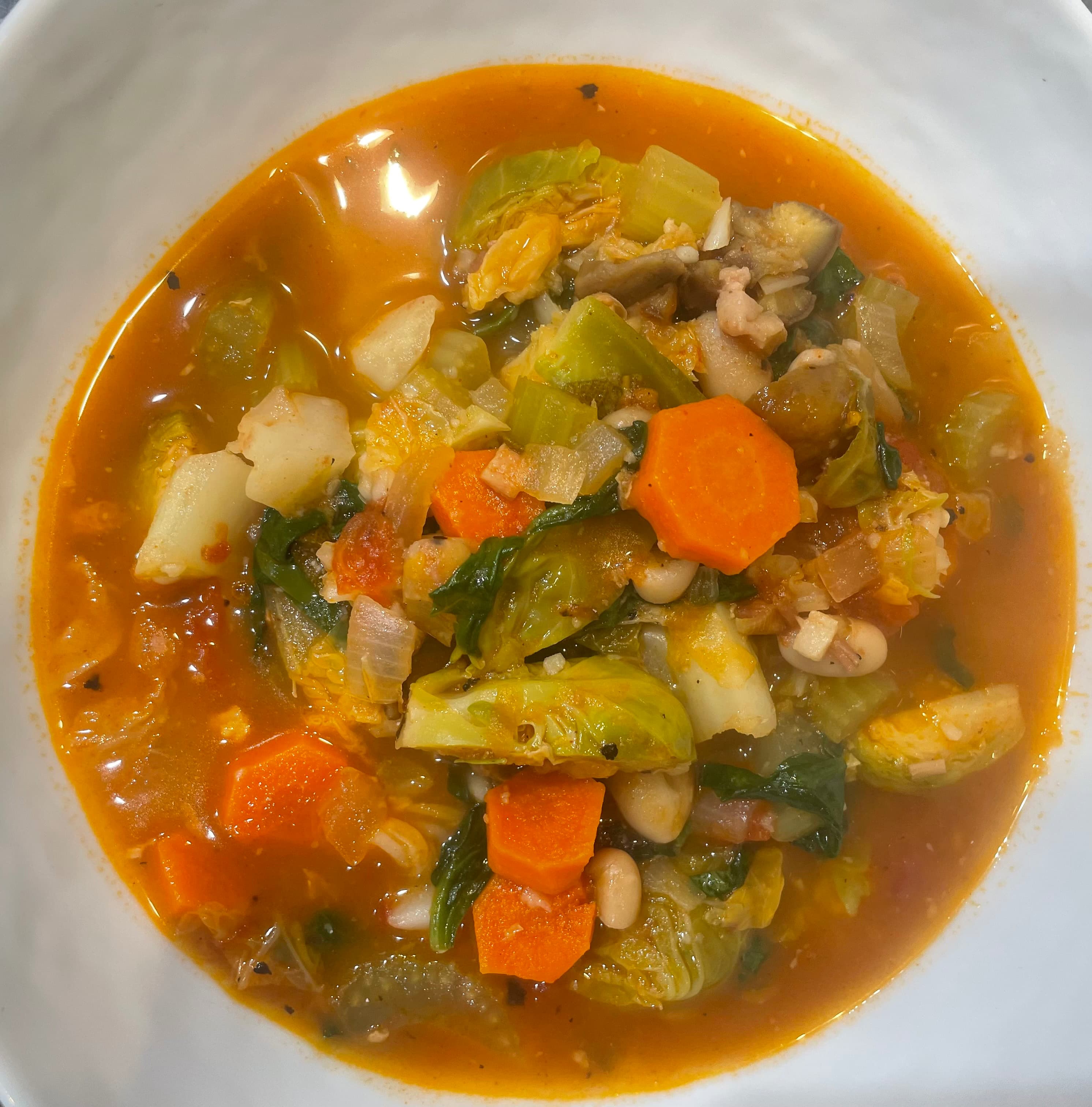 Fall Vegetable Stew - first longer rain showers in the Bay Area, time for some warm stew with savoy cabbage, brussels sprouts, carrots, white beans, baby spinach, celery, chestnuts, onions, diced tomatoes, garlic, sage, basil, tomato paste, parmesan and vegetable broth