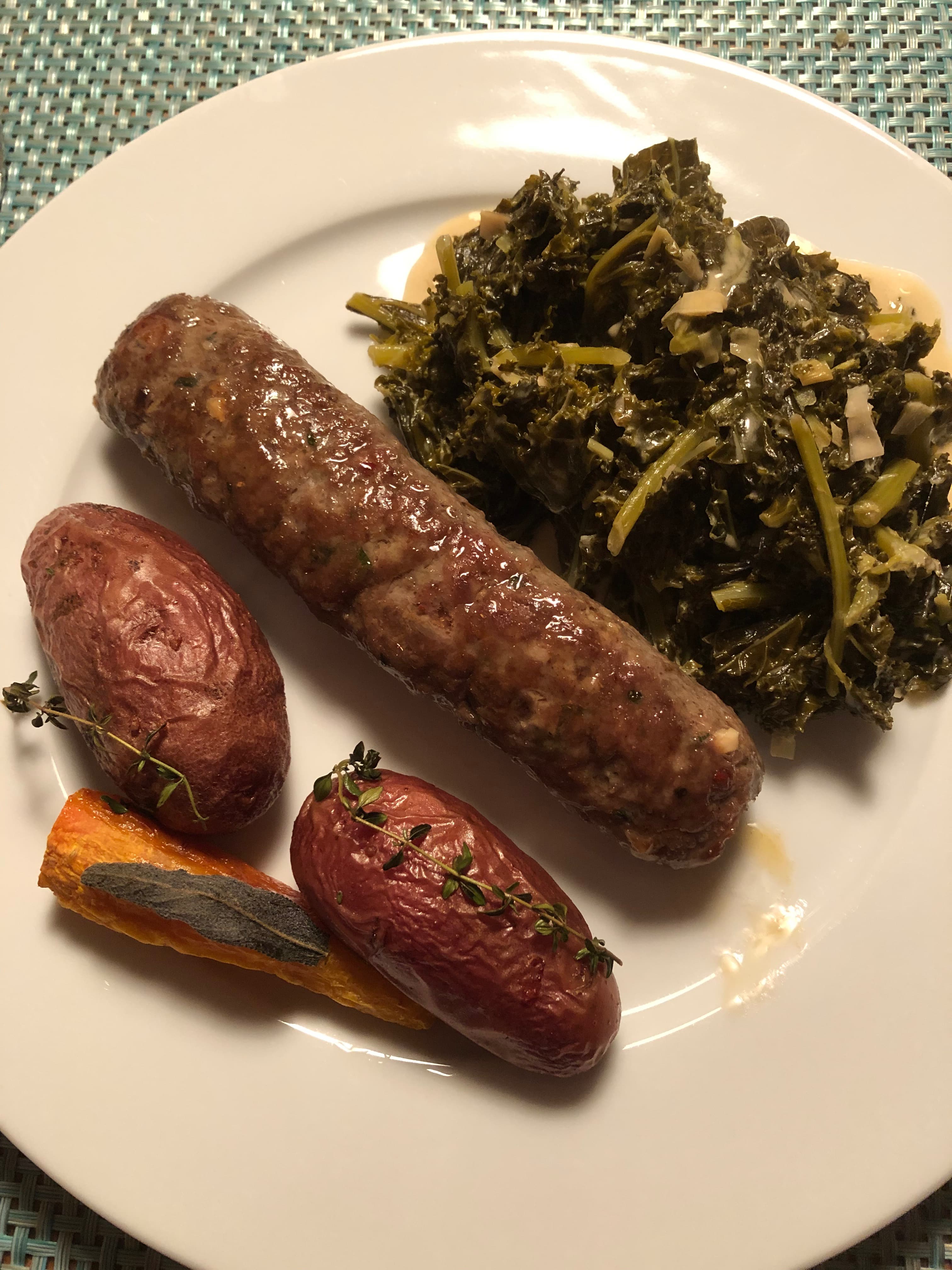 Last dinner for my sister, who heads back to Arizona tomorrow. Fabulous lamb kofte from the posh butcher, creamed baby kale, roasted FM veg with garden herbs from a friend. Imagine our surprise when the flesh of the fingerlings turned out to be pink!!