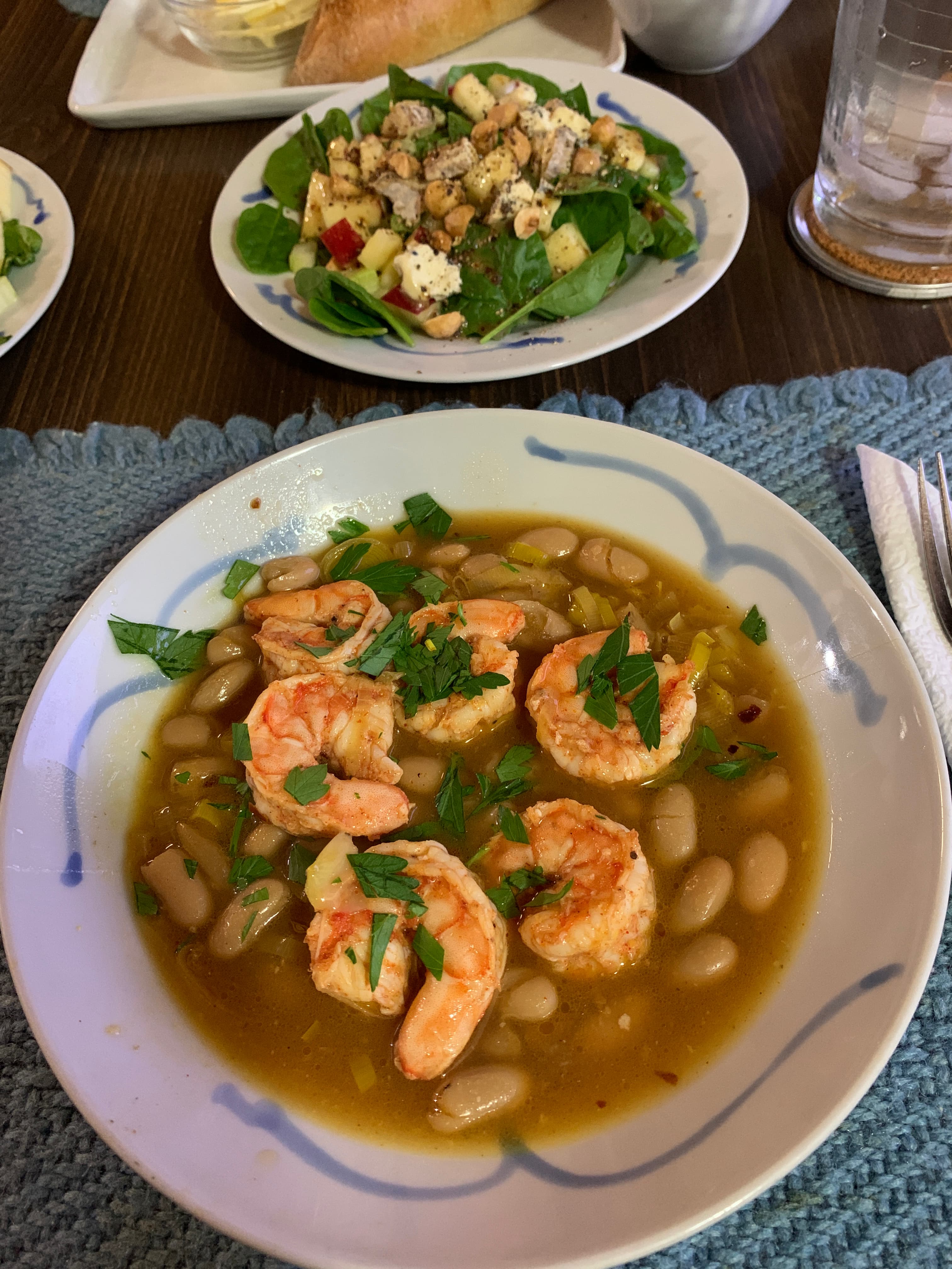 By request, sister cooked me NYT lemony shrimp and bean stew. Delicious. I was allowed to prepare the composed spinach salad which included celery, apples, hazelnuts, and cambozola cheese dressed with homemade honey mustard dressing. Warm baguette and butter were needed to sop up the juices of everything. I may have licked my plate. We ate late because we’re trying to learn to play gin rummy.