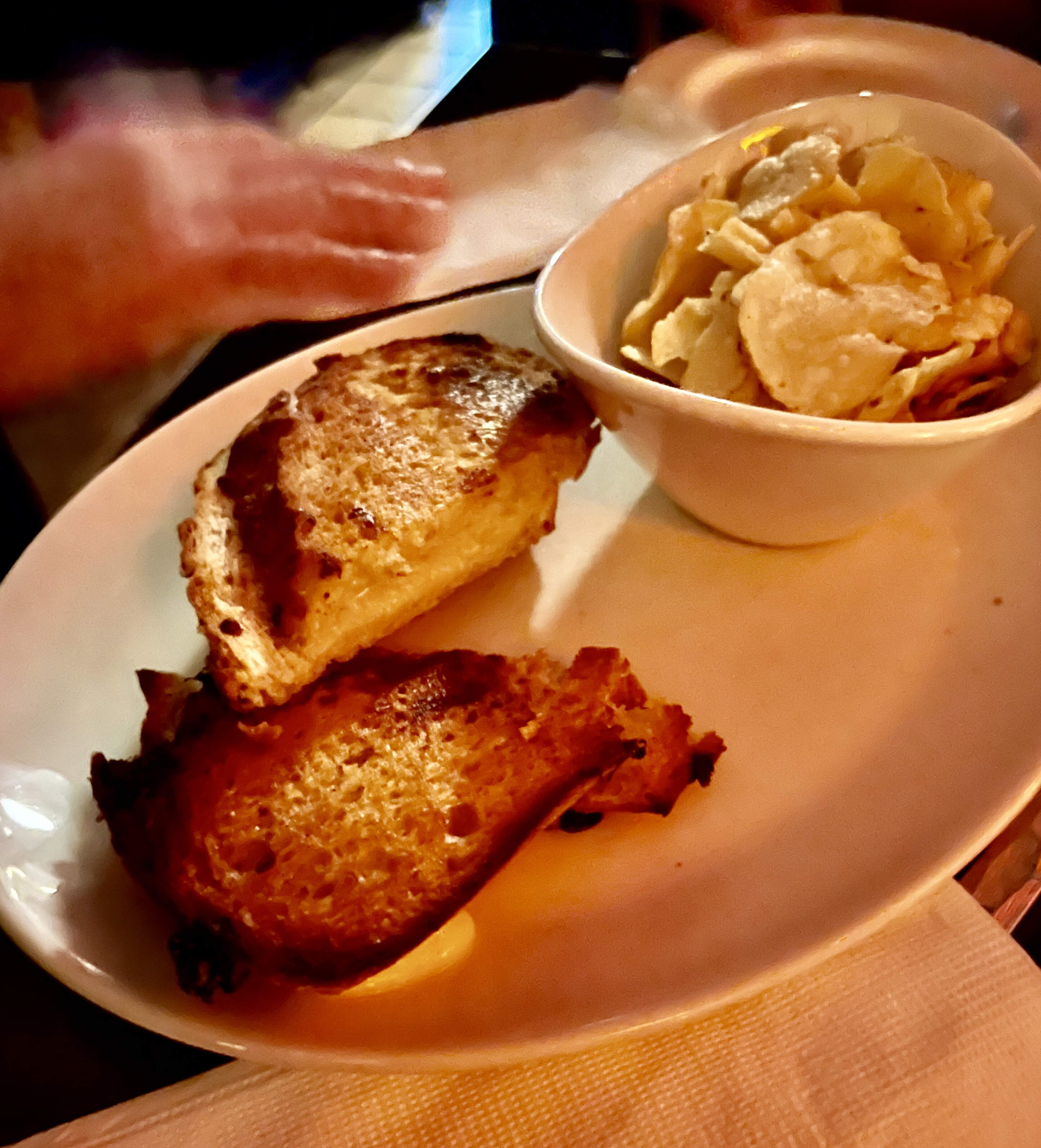 and the grilled cheese: tiny, and not even close to what my PIC whips up ('taint rocket surgery, after all), and which is what I asked him to do when we got home. Both GCs for your comparison below.