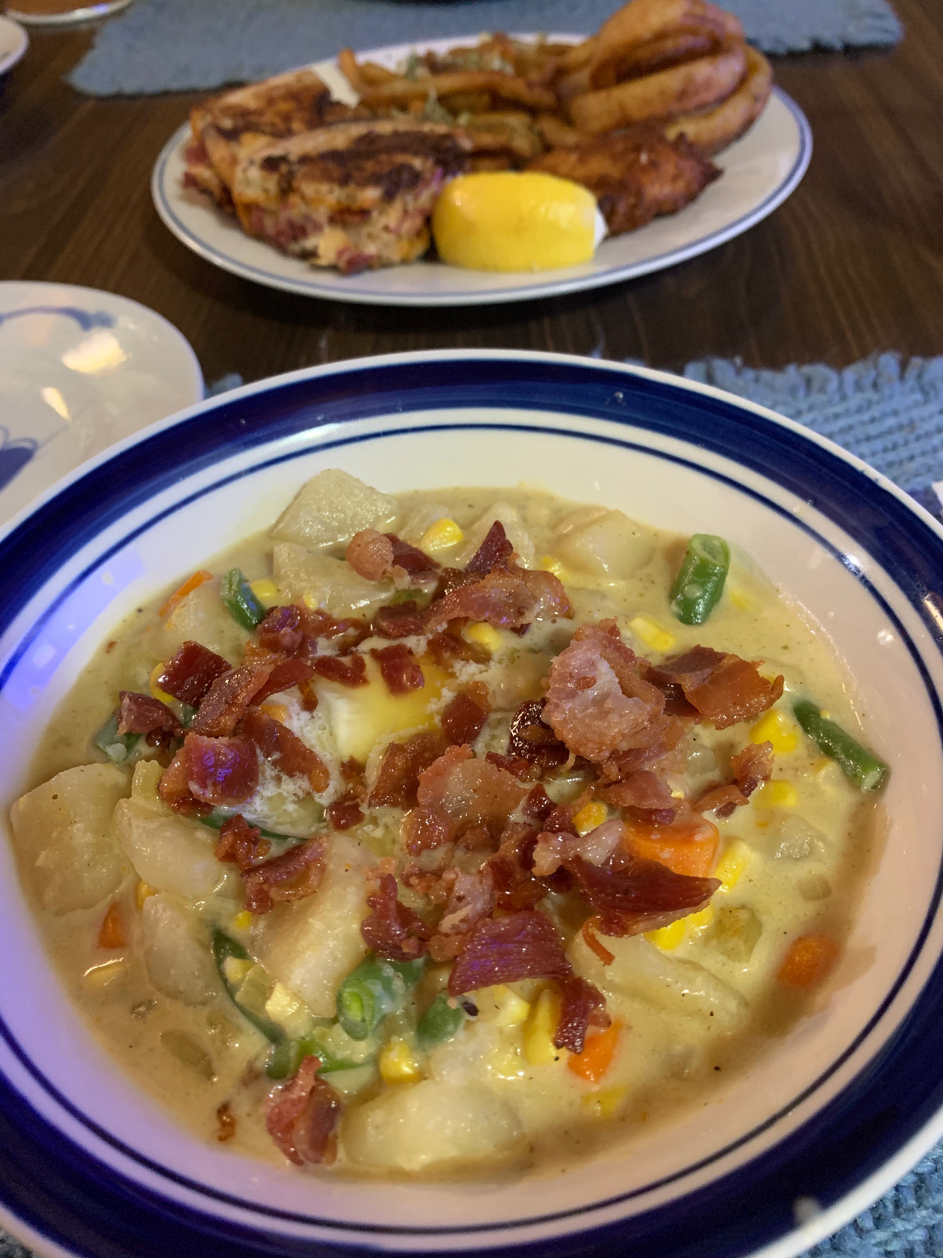 Dinner tonight was leftovers from our lunch in town; Reuben sandwiches, garlic fries, a piece of fried cod, and some onion rings. New addition was a potato and fresh corn off the cob chowder made with mirepoix, homemade chicken broth, herbs, haricots verts from the garden, bacon crumbles, cream, and butter because everything else didn’t have enough fat. I’m sure we’ll have Bordeaux Cherry ice-cream for dessert as my motto is too much is never enough. Speaking of mottos, Sans Peur is Sutherland’s of which I am a member. Without fear. Slainte mhath.