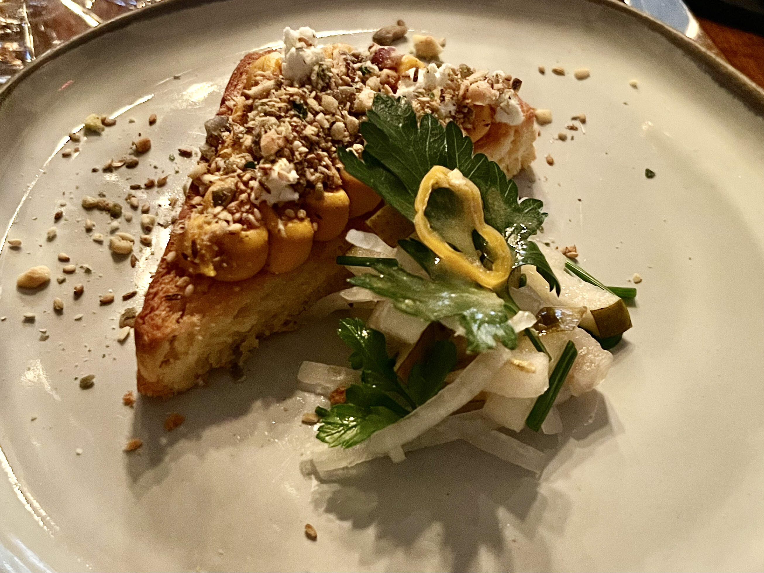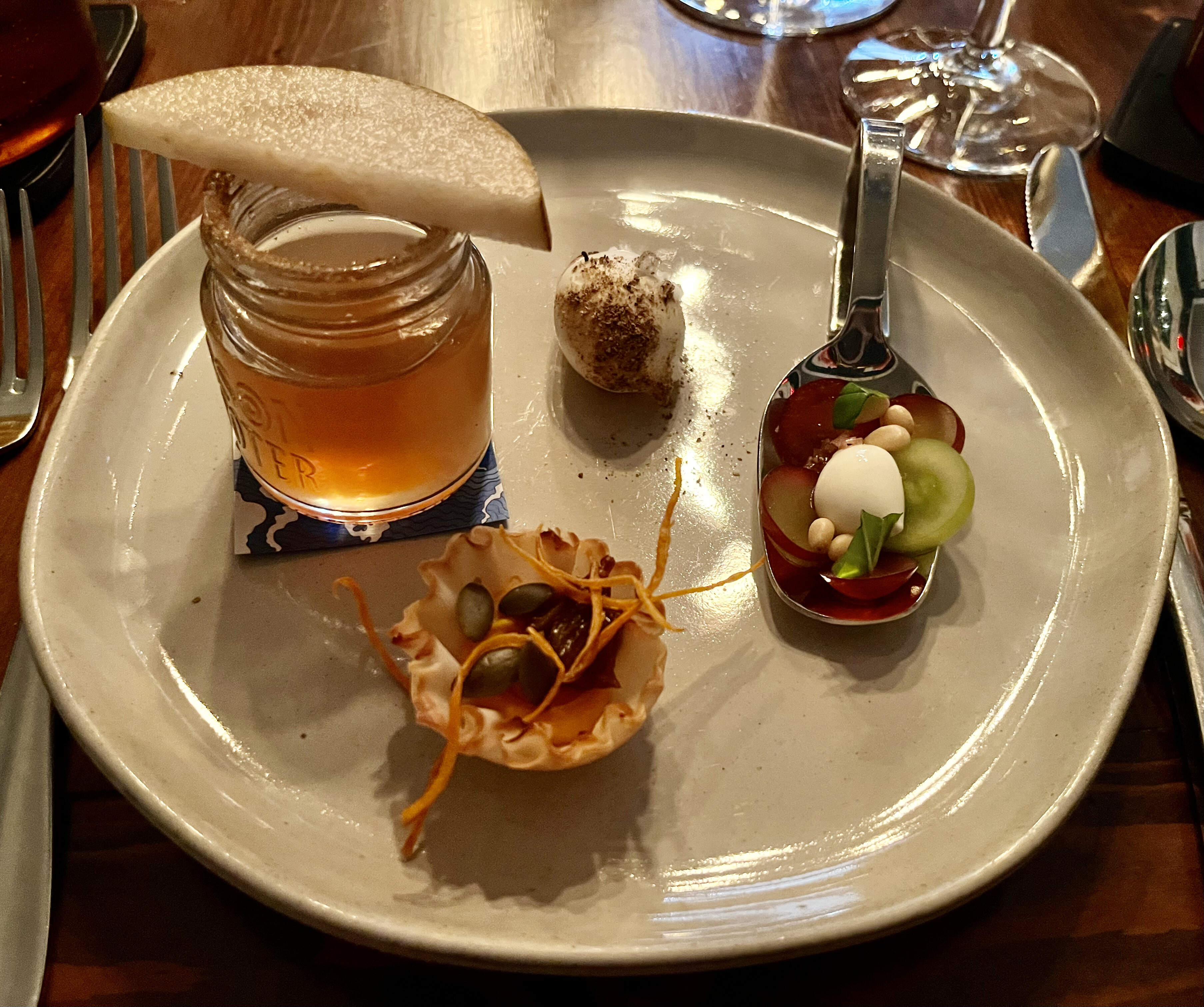 The welcome bites were a hot apple cider shooter with cinnamon & Asian pear, French radish with cultured butter and dried mushroom, pickled grapes with yogurt, basil & other sundry items I can’t remember RN, and curried squash hummus with pepitas and crispy squash. Nice.