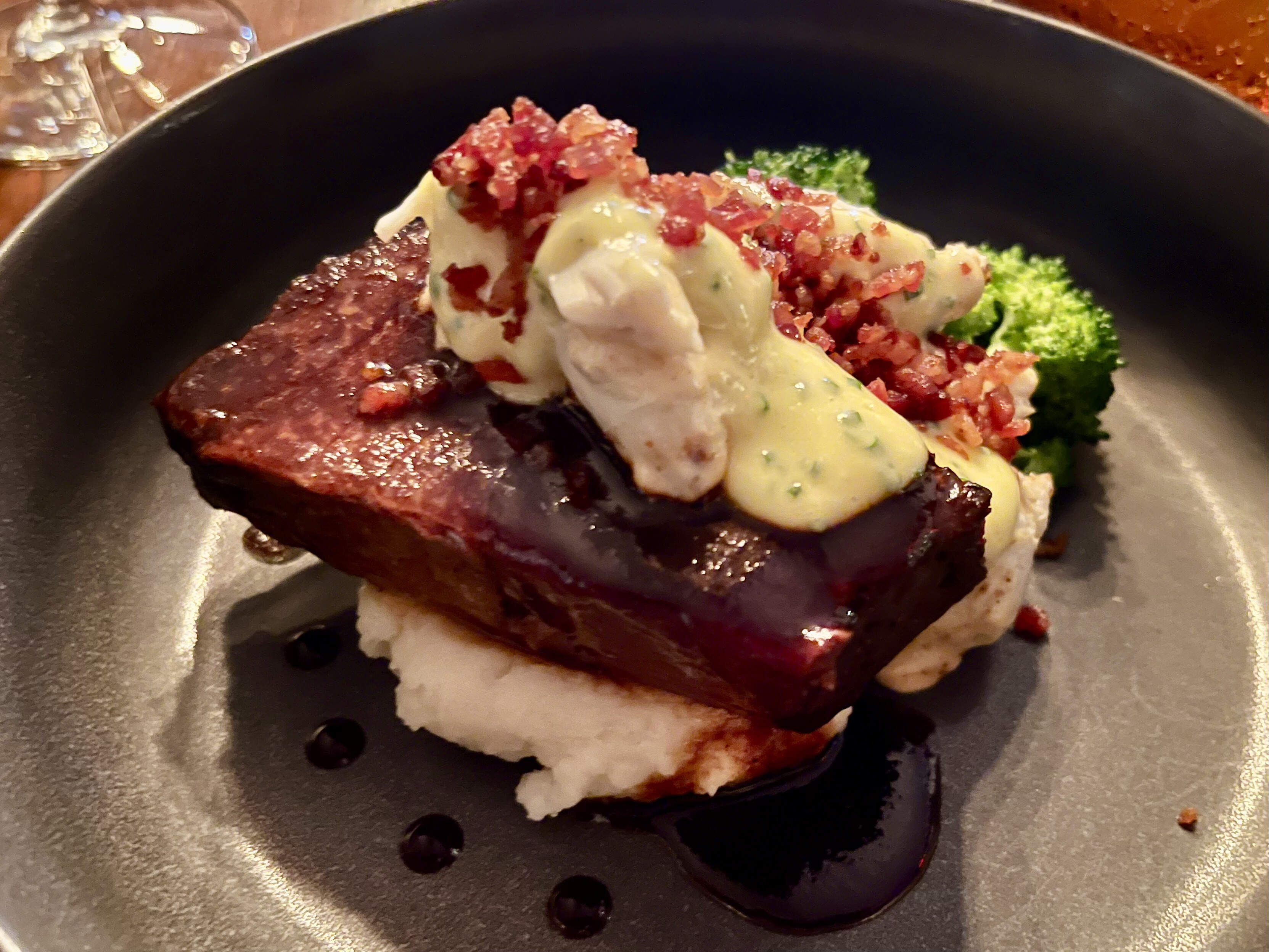 The main event was an incredibly tender, flavorful, but very very very rich red wine braised short rib “Oscar” with mashed potato, broccoli, blue crab, bacon & chive hollandaise.