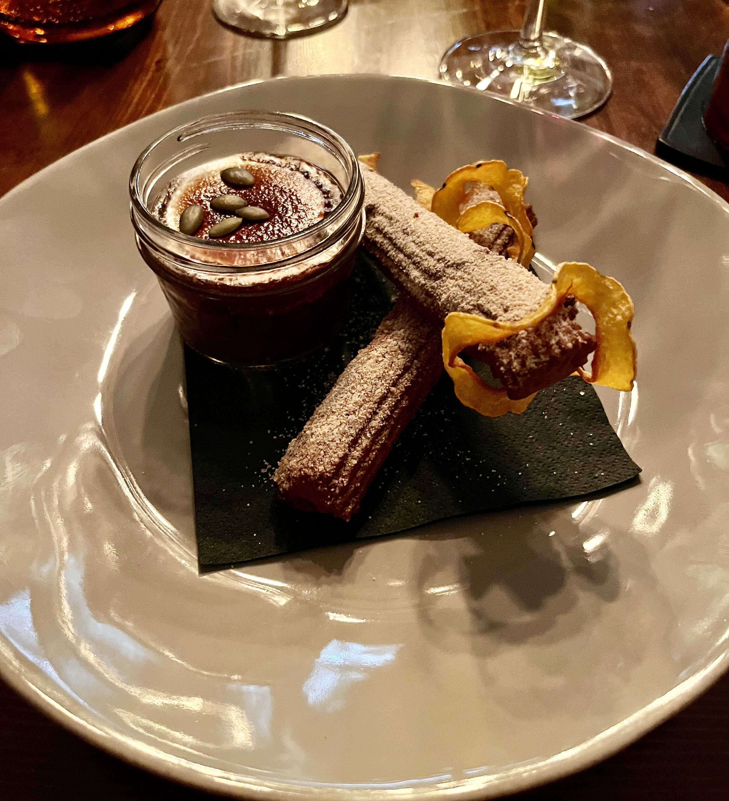 The dessert was delish, but also just too much at this point: pumpkin churros with Mexican chocolate, chili, apple butter dulce de leche, toasted marshmallow, delicata chips.