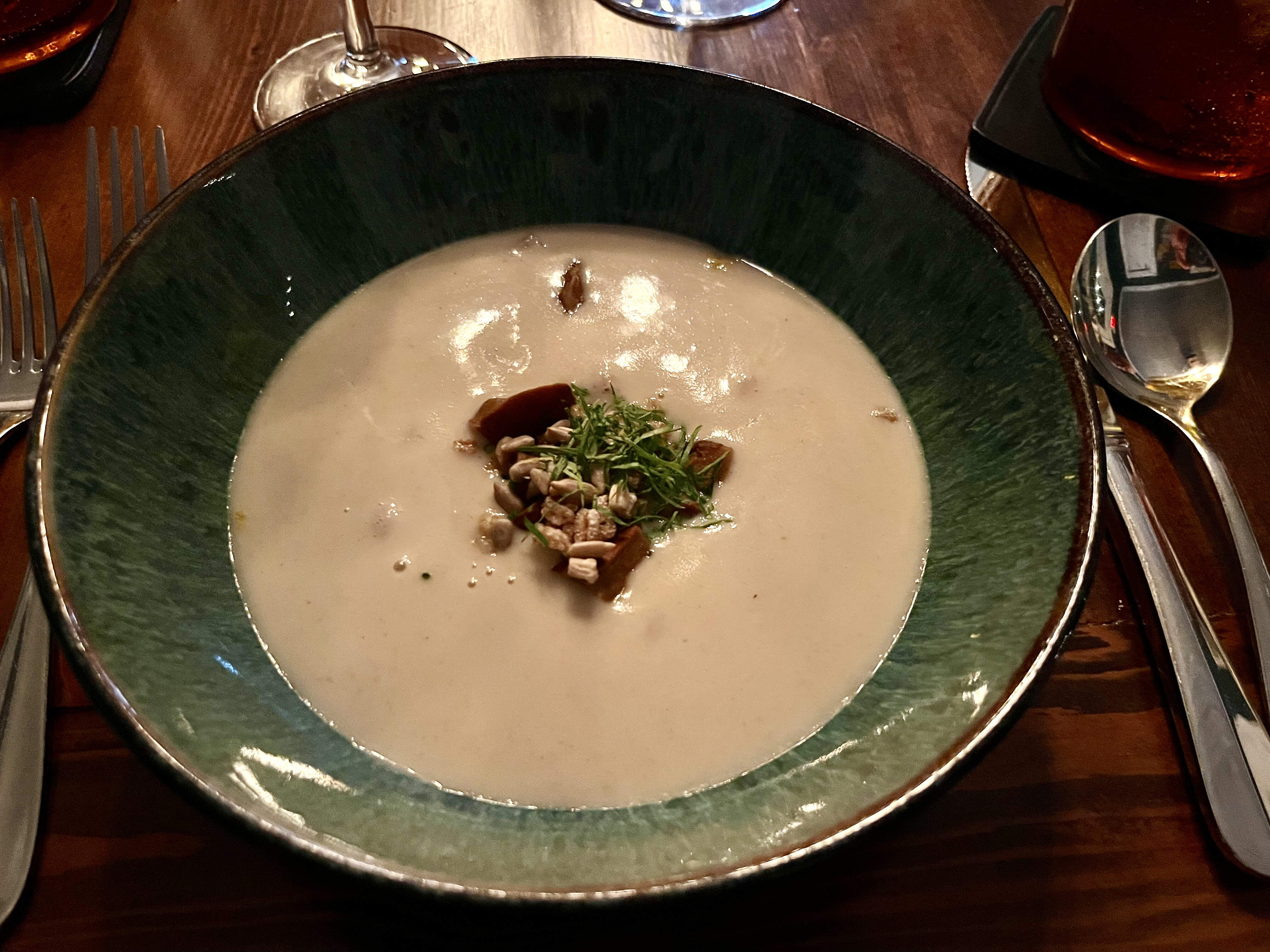 First course was a very good sunchoke & lobster mushroom soup with roasted garlic, farro, sunflower seeds, parsley, thyme, lemon. Very good, one of the best dishes of the night.