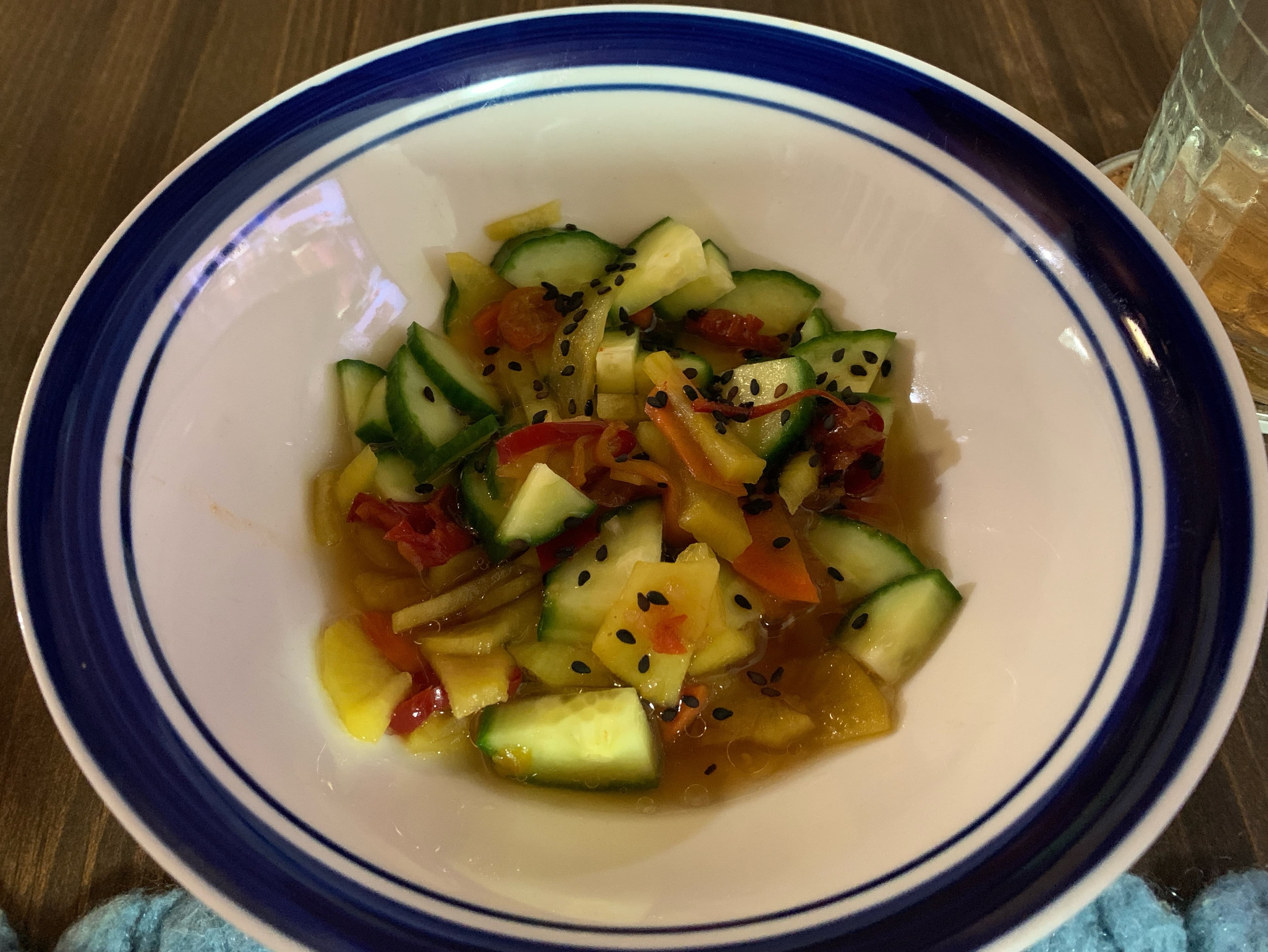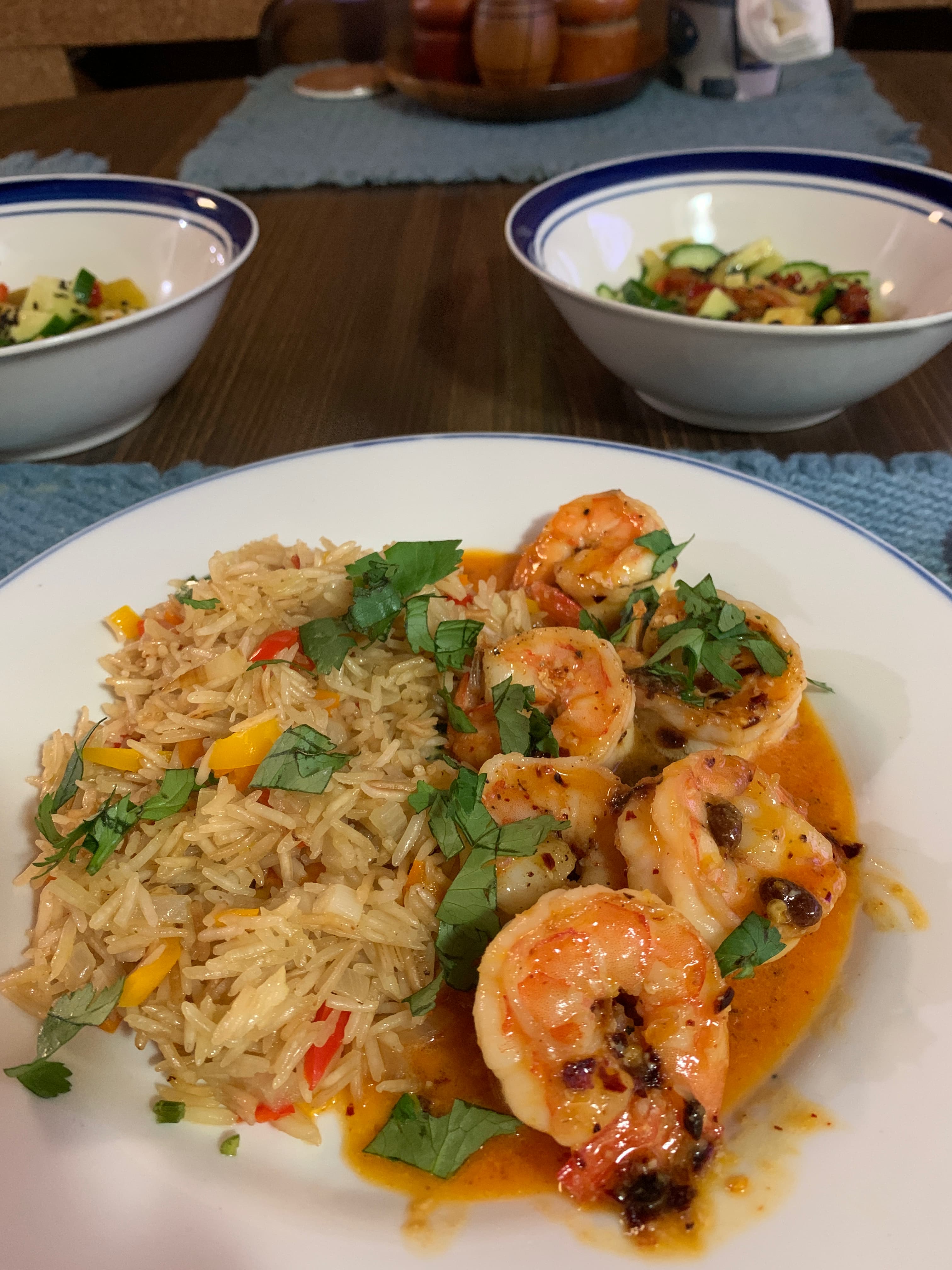 My last dinner at Chez @BeefeaterRocks was a recipe from the latest edition of Food & Wine. Sister made Szechuan Chile Butter Shrimp that she just happened to have every ingredient needed. Go figure. It was wonderful. My contribution was chopping pickled daikon, carrots, and fresh cucumbers dressed with olive oil, sweet chili sauce and black sesame seeds for our salad. I’ll miss this wonderful food but not as much as I’ll miss my sister.