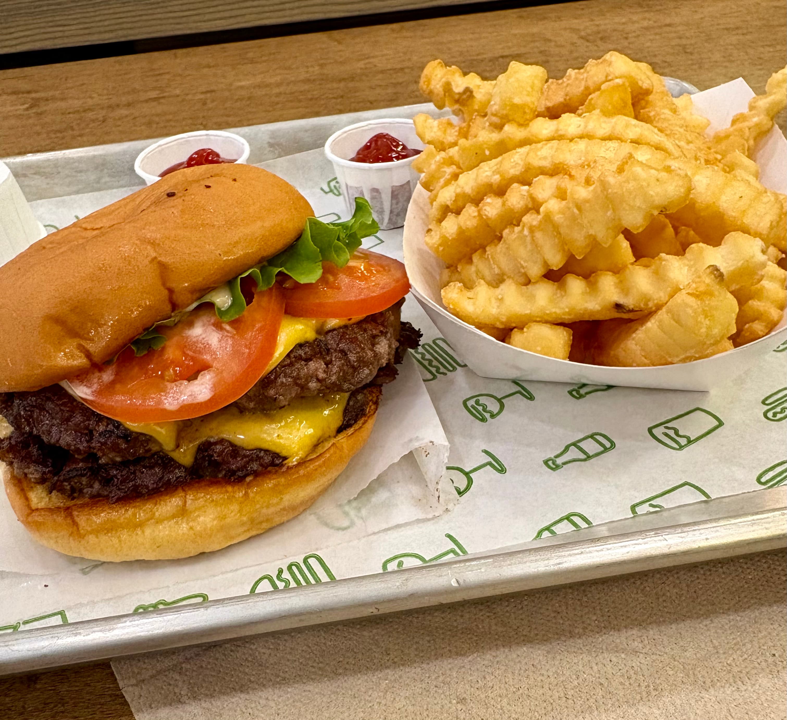 The burger was super juicy and greasy, in a good way but pretty small, fries were decent but could have been crispier, service was friendly and swift and the place was clean. I’d go back just to try the famous milk shakes, but probably not the burgers or other sandwiches as there’s a plethora of locally owned burger joints that I’d rather support. 7/10 smashes from me. First time trying Shake Shack as well.