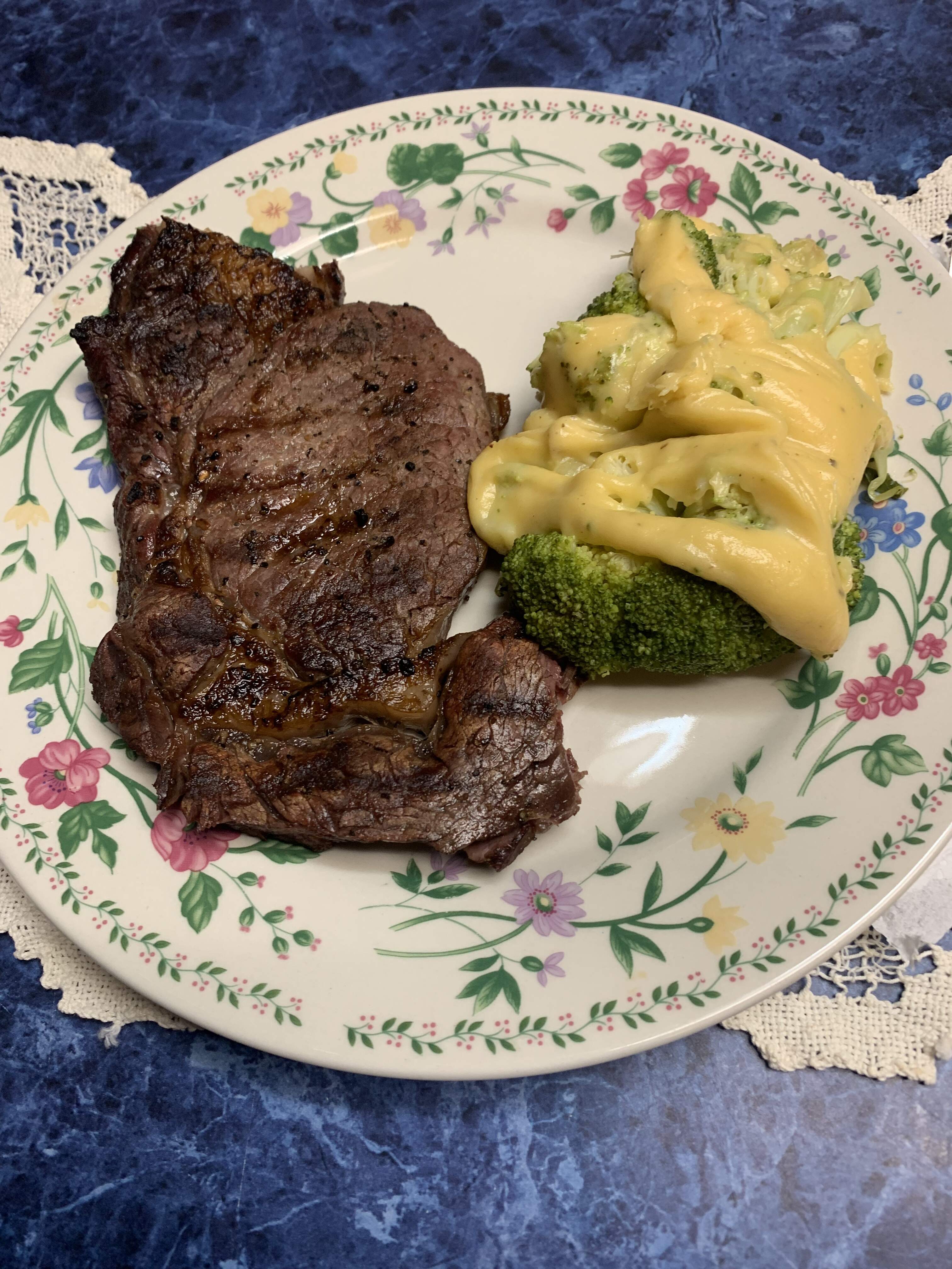High of 82* today. Supposed to be 45* in the morning. Can’t wait. Grilled out ribeye and steamed broccoli topped with a thick buttery sharp cheddar cheese sauce.