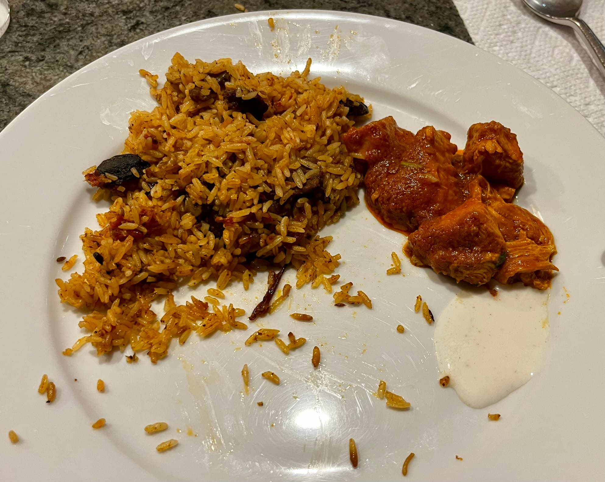 The rice had a nice kick to it, but it was hard to distinguish some of the meat pieces from the cardamom pods, which were rather unpleasant to bite into, especially expecting something different. The butter chicken was more plentiful on the meat front this time, but devoid of any heat. The order of garlic naan was just one piece, and it was stale. Guess we won’t order from them again ![]()