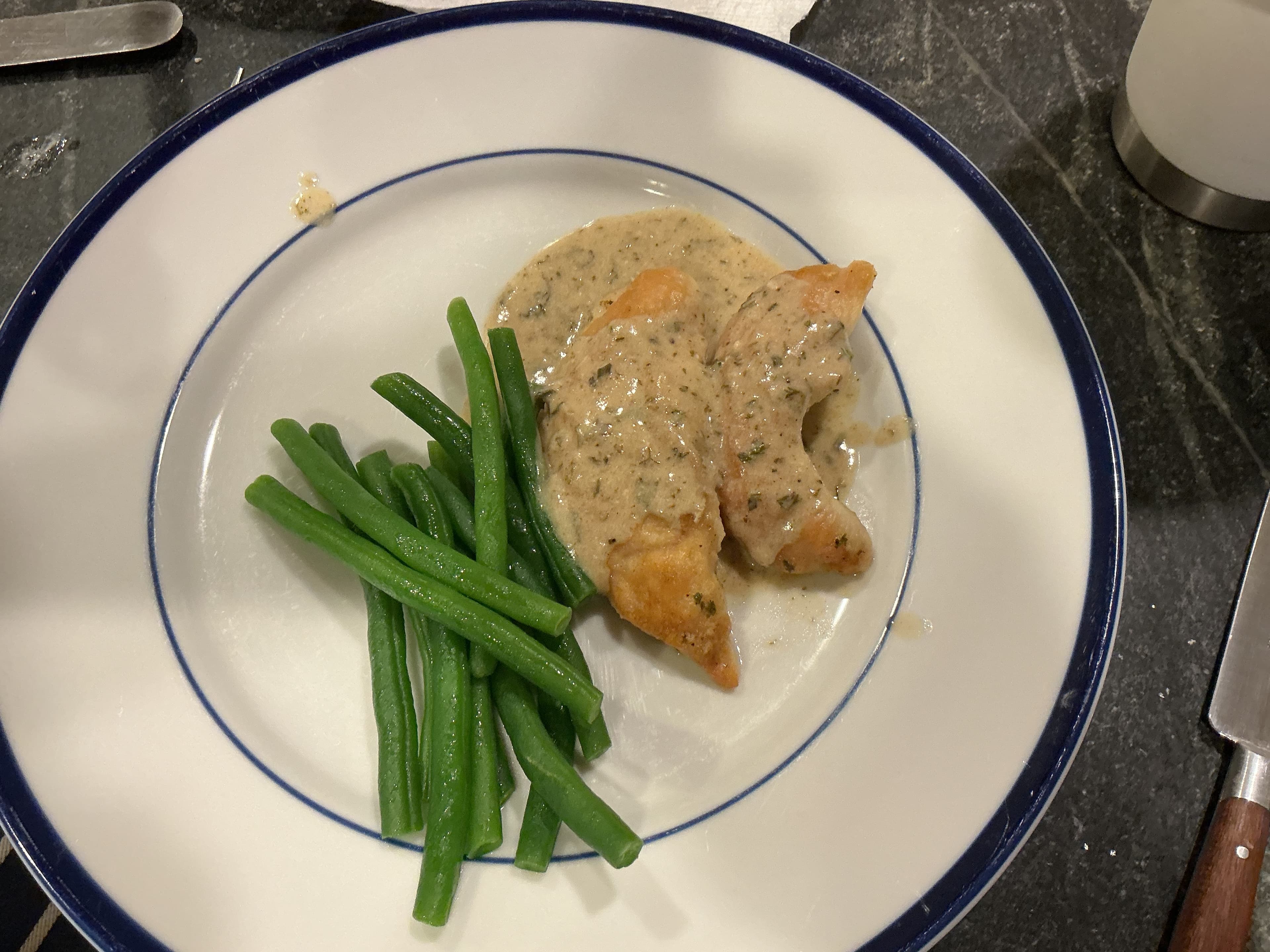 A nice fifteen minute dinner, chicken tenders with a white wine, fine herbes, Dijon, and crema pan sauce. Blanched beans tossed in butter.