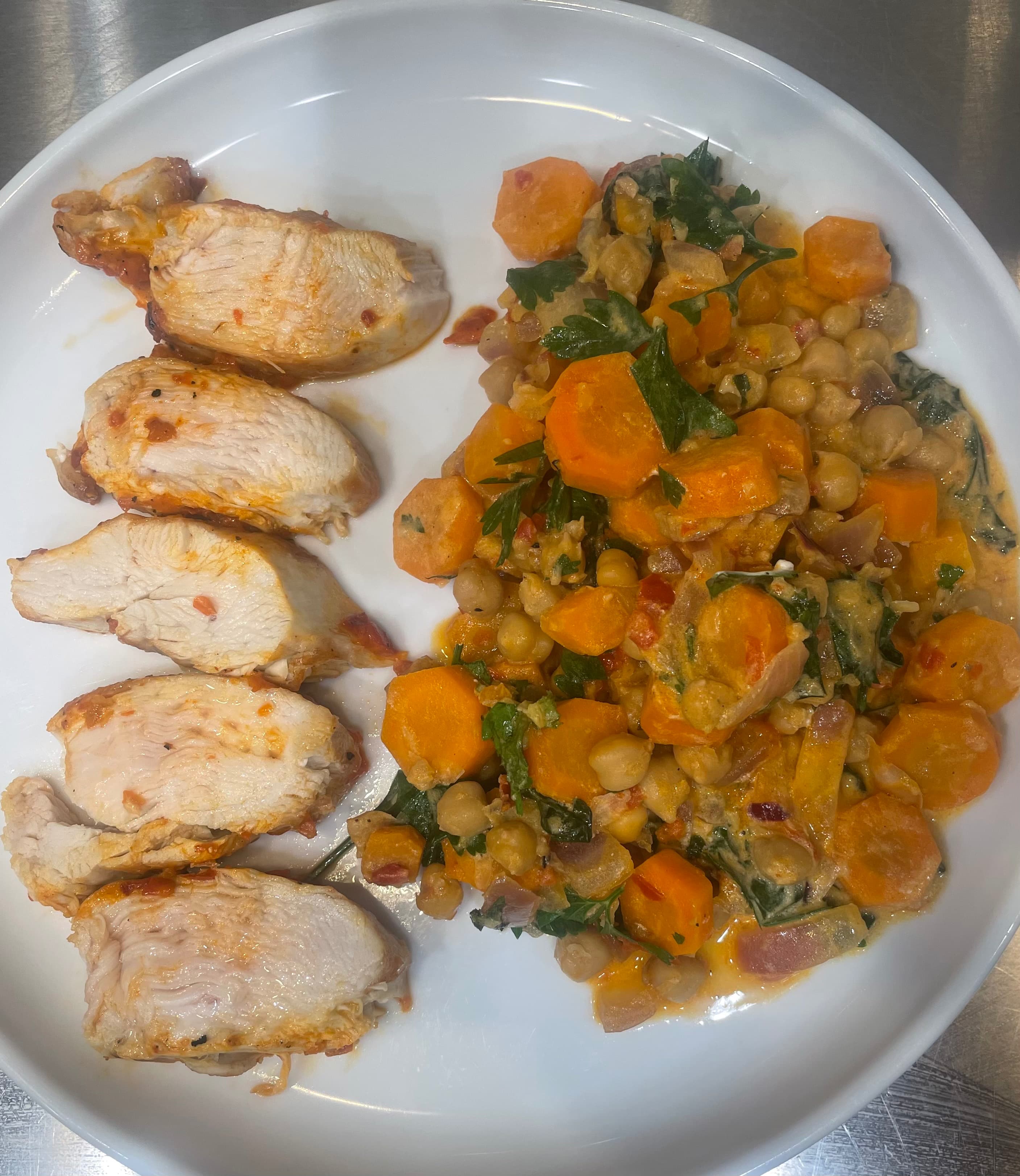 Ajvar-Chicken with Carrots - chicken breast is quickly pan-seared, before smeared with ajvar and finished in the oven. Carrots, chickpeas, red onions and garlic are sautéed and cooked with a mix of vegetable broth and ajvar before finished with sour cream, mint, parsley, lemon zest and juice
