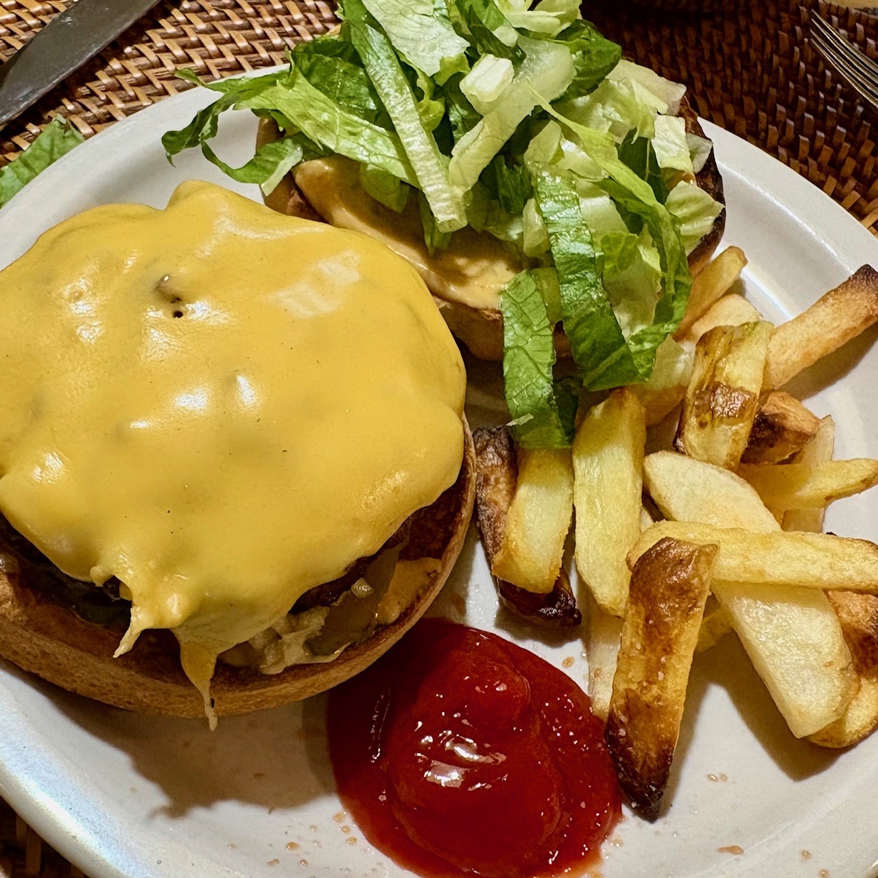 Burgers on the Big Green Egg with all the usual suspects. Store-bought potato buns. Kennebec potatoes in the air fryer.