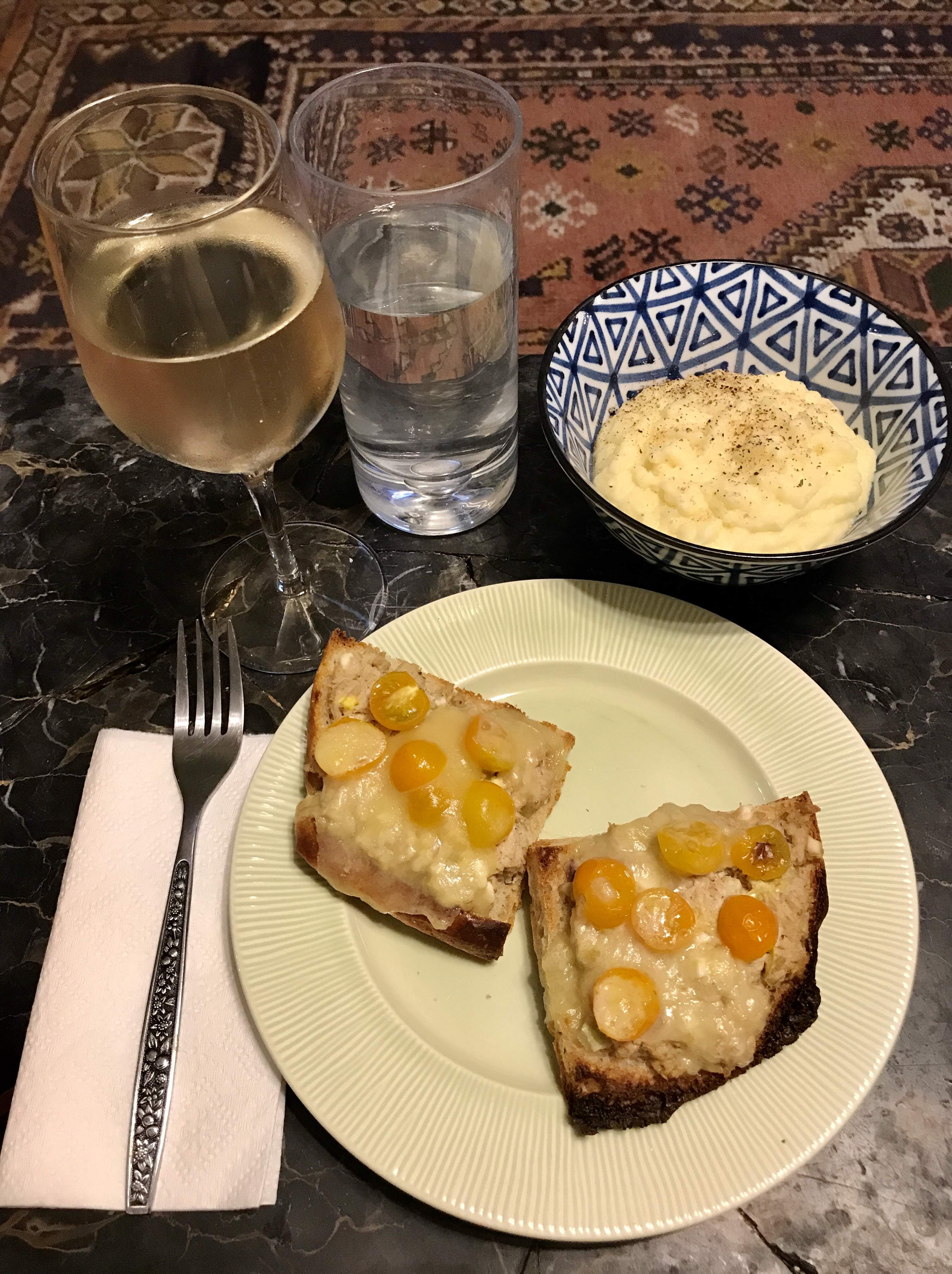 Tuna melt on focaccia (which I made) with tomatoes (which I grew). And mashed potatoes (which I had no hand in).