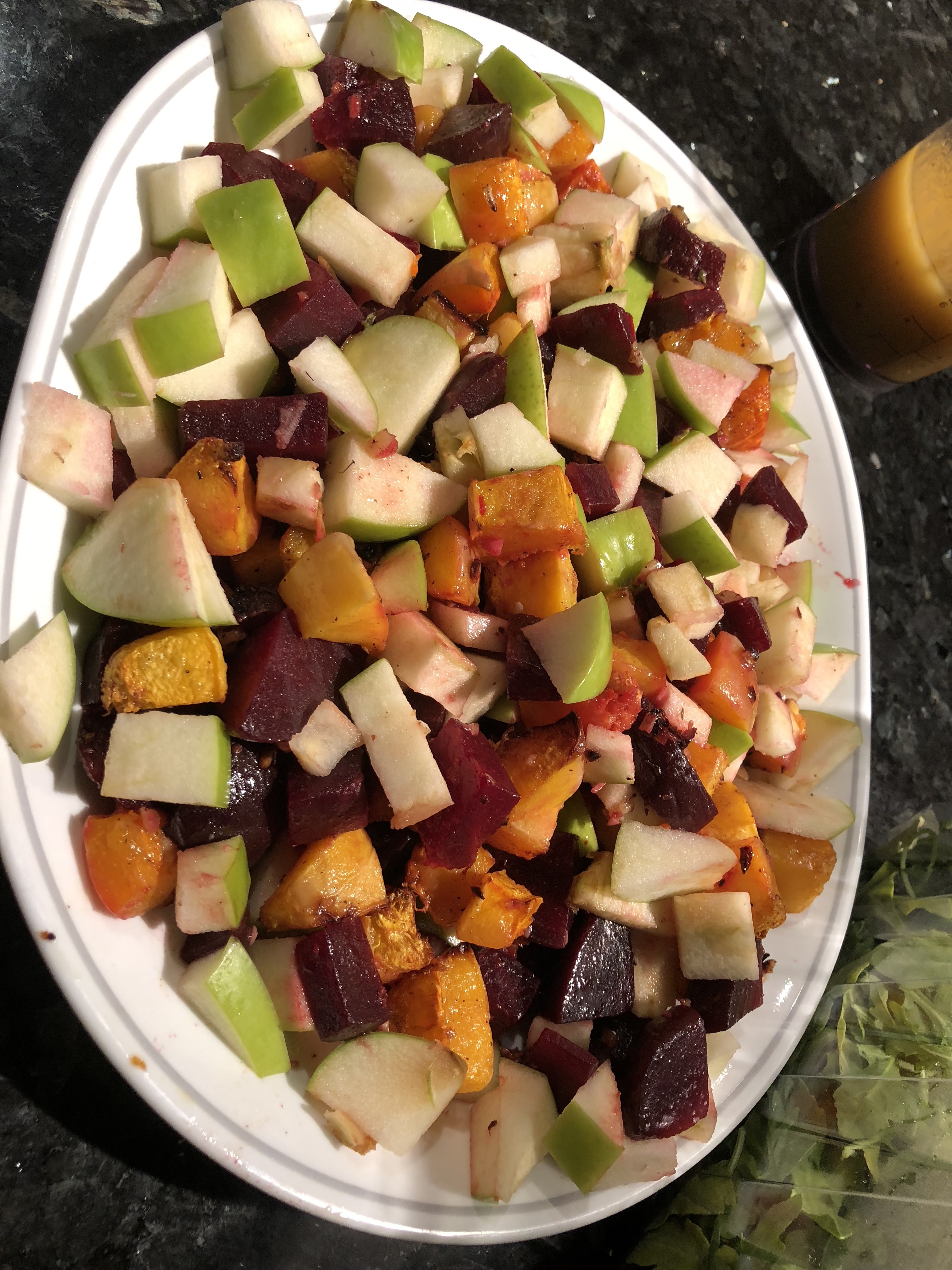 Tonight, I have just finished making the butternut, beet, apple salad ( picture) , then will add baby arugula , home made vinaigrette. Top with feta cheese for me and guest but son will have his with parmesan.picture did not show baby arugula, or feta. It was good.
