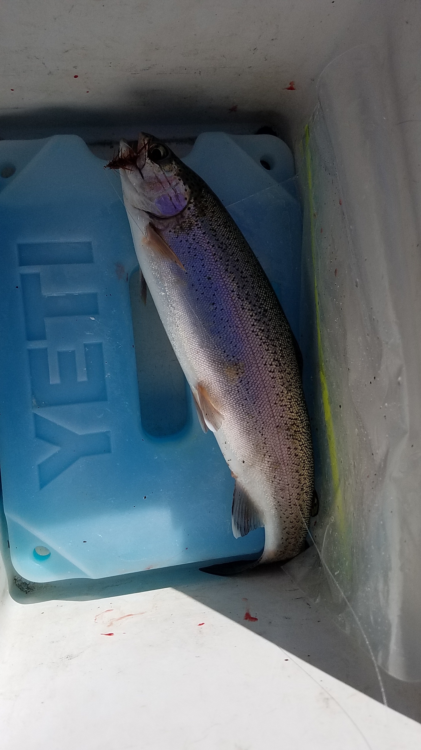 Catch and cook. I always release these trout , but today I wanted fish for dinner . Floured , pan fried in butter. Very tasty and my favorite part is the crispy skin. Basmati rice , the roe on top . I do like the sweet Chile garlic sauce with my rice . Cucumber and onion salad with rice vinegar , sugar , and , water dressing . Wine to drink. Cheers