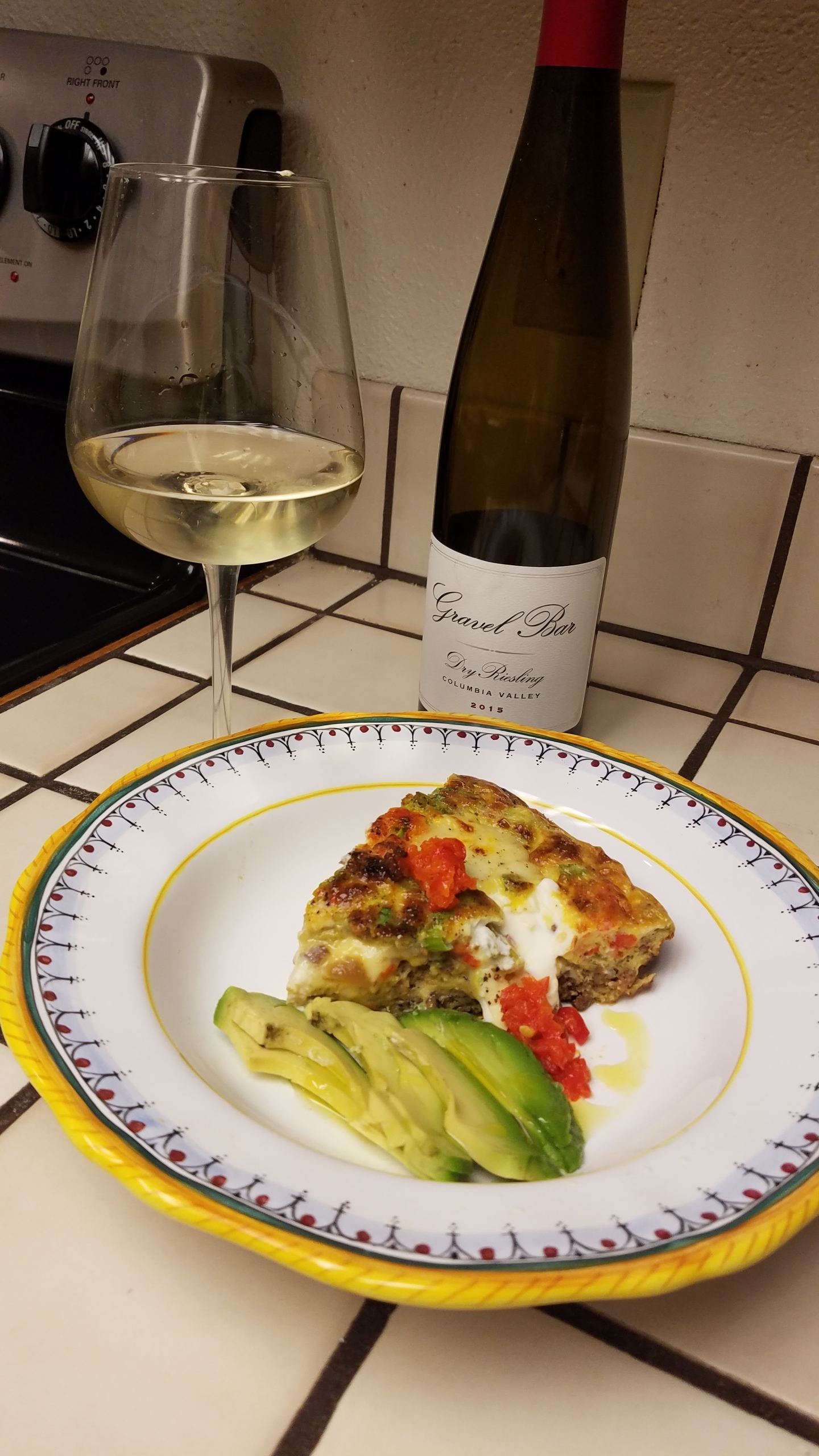 Frittata. Cleaning out the fridge . Wine to drink . A dry Riesling from Oregon. Gravel Bar 2015 Columbia valley. Cheers 20181221_221838|393x700