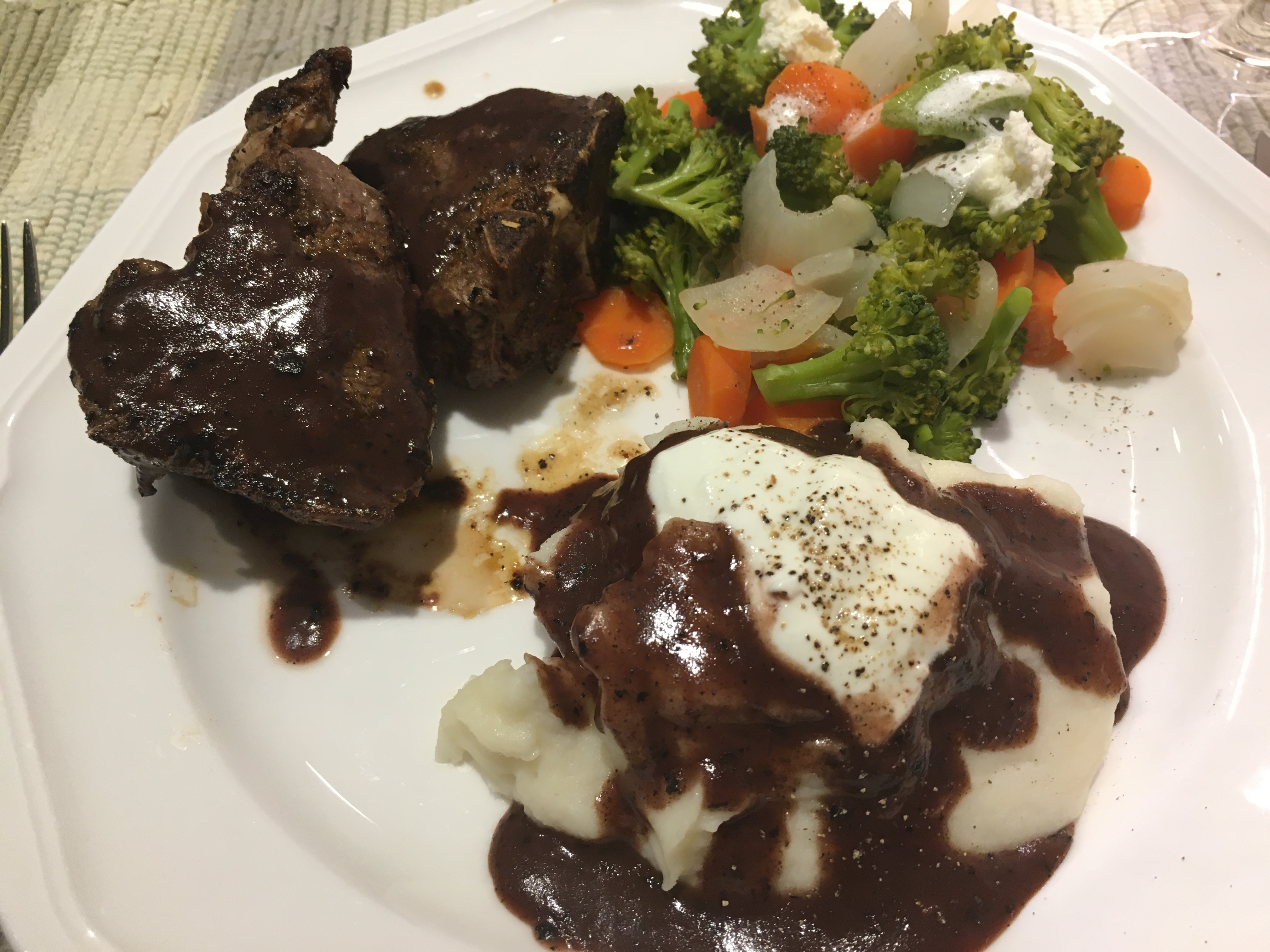 Dinner last night. H cooked loin lamb chops to a perfect rare/med rare, reduced merlot & beef stock pan stock, mounted with butter. Broccoli & carrots. Merlot to drink. I ate and drank. Hit the spot.image|700x525