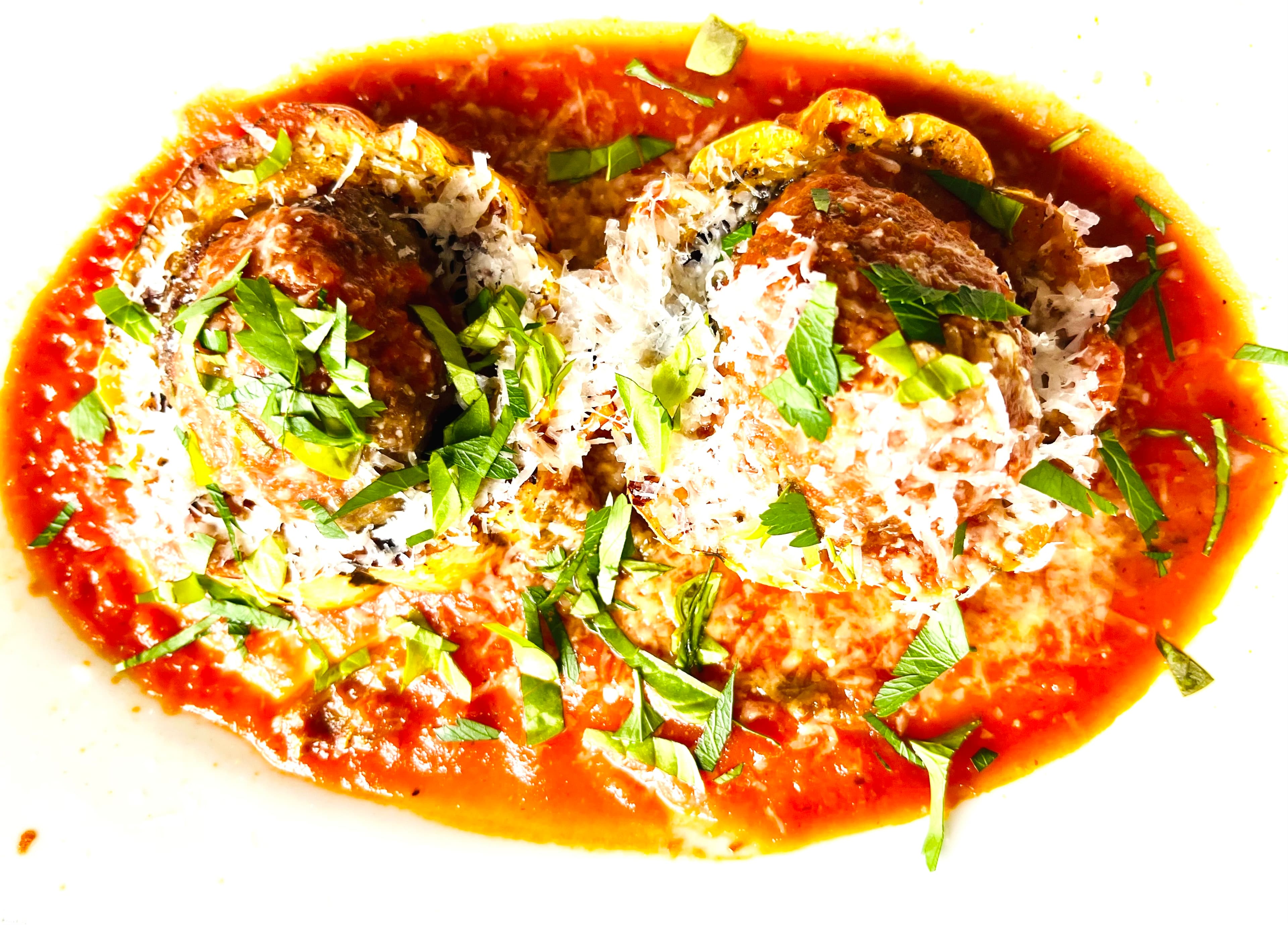 Delicata squash with more ‘shrooms and meatballs, a ladful or so of pork ragu, fresh herbs and pecorino.