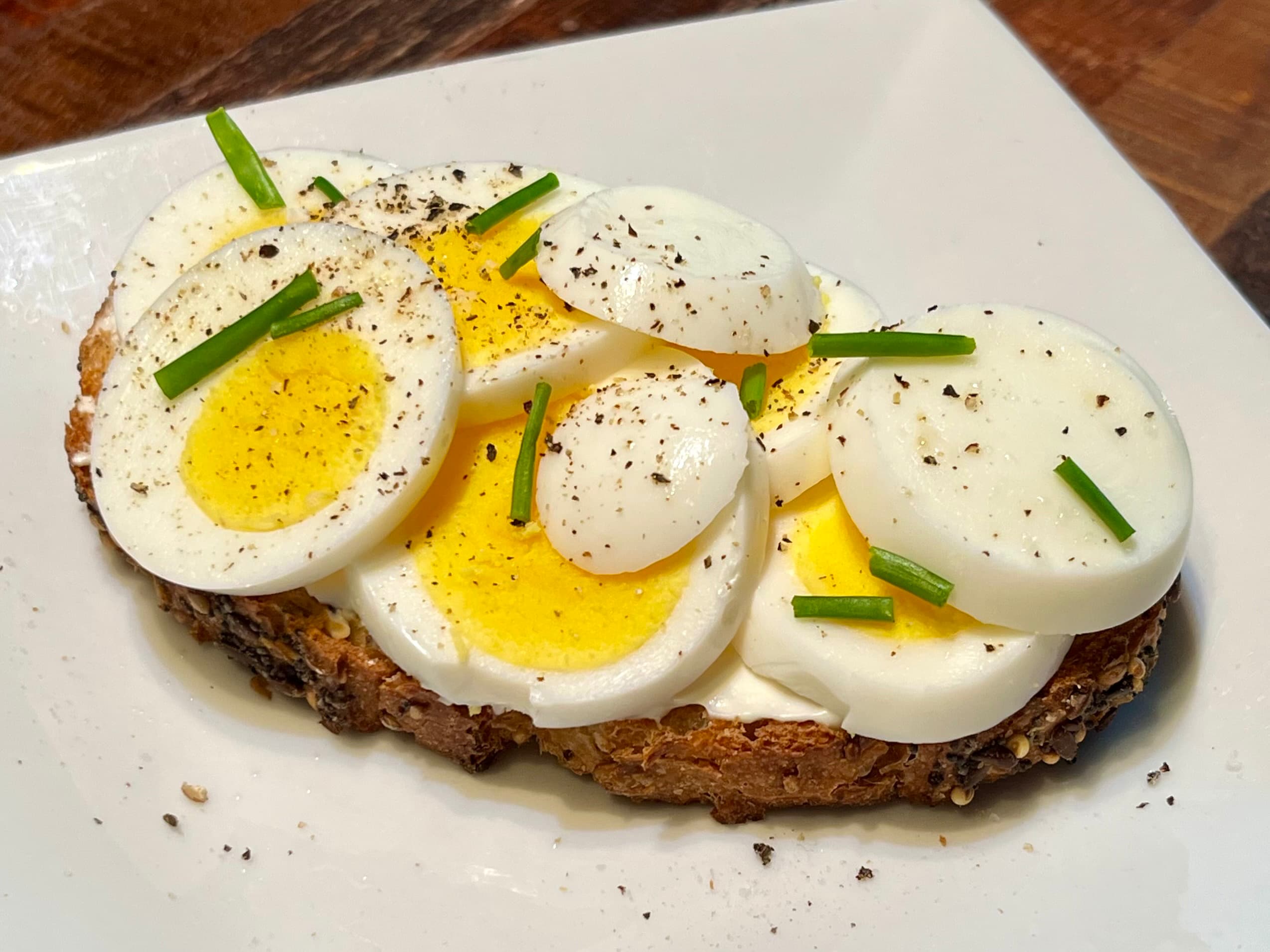 An open-faced egg sammich with local cream cheese & local eggs on Wegmans seeded bread.