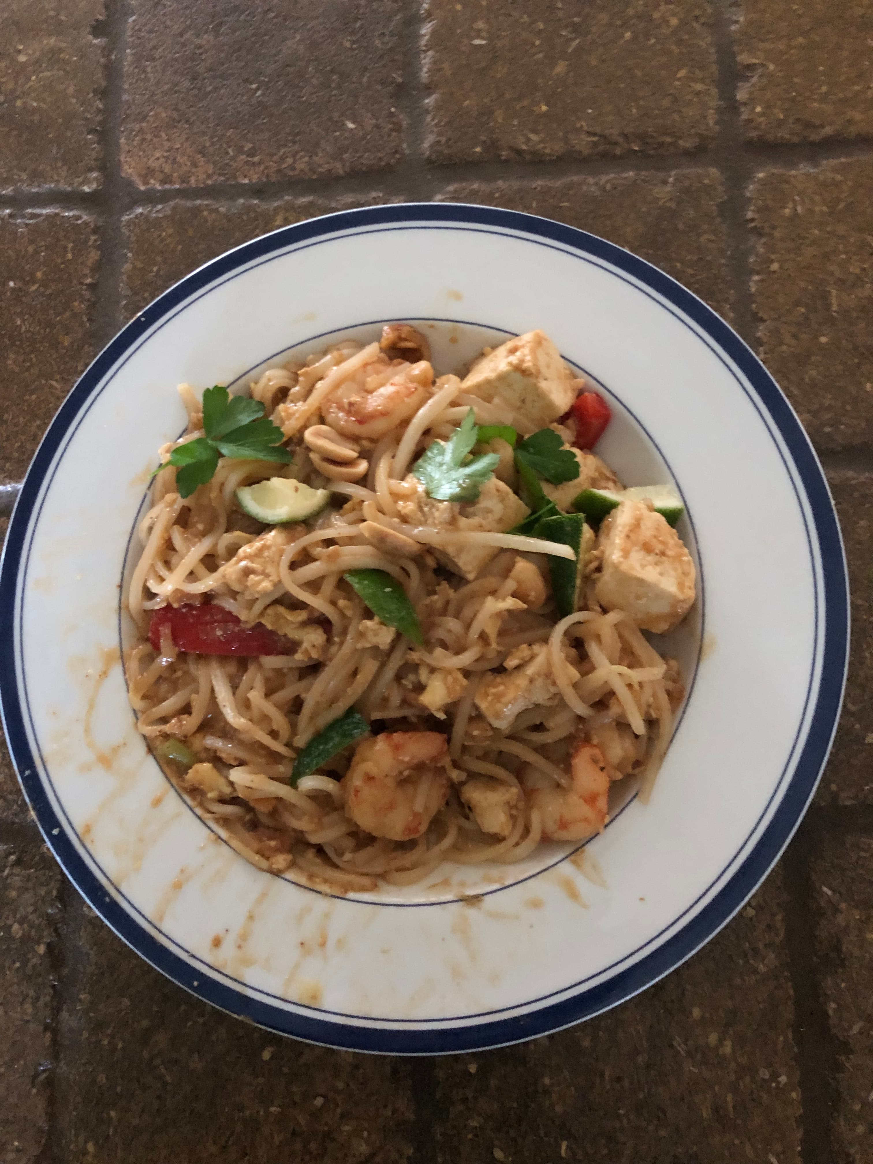 A pantry clearing exercise that resulted in Pad Thai (“Bad Thai”? “Bachelor Pad Thai”? “Pantry Thai Raid”?) using some old rice noodles, the last of a frozen bag of Argentinian red shrimp, a snack package of Planter’s peanuts, an 87 cent package of Saffron Road Pad Thai Simmer sauce (serviceable) along with the usual tofu, scrambled eggs, bean sprouts, bell pepper, cilantro, and lime wedges.