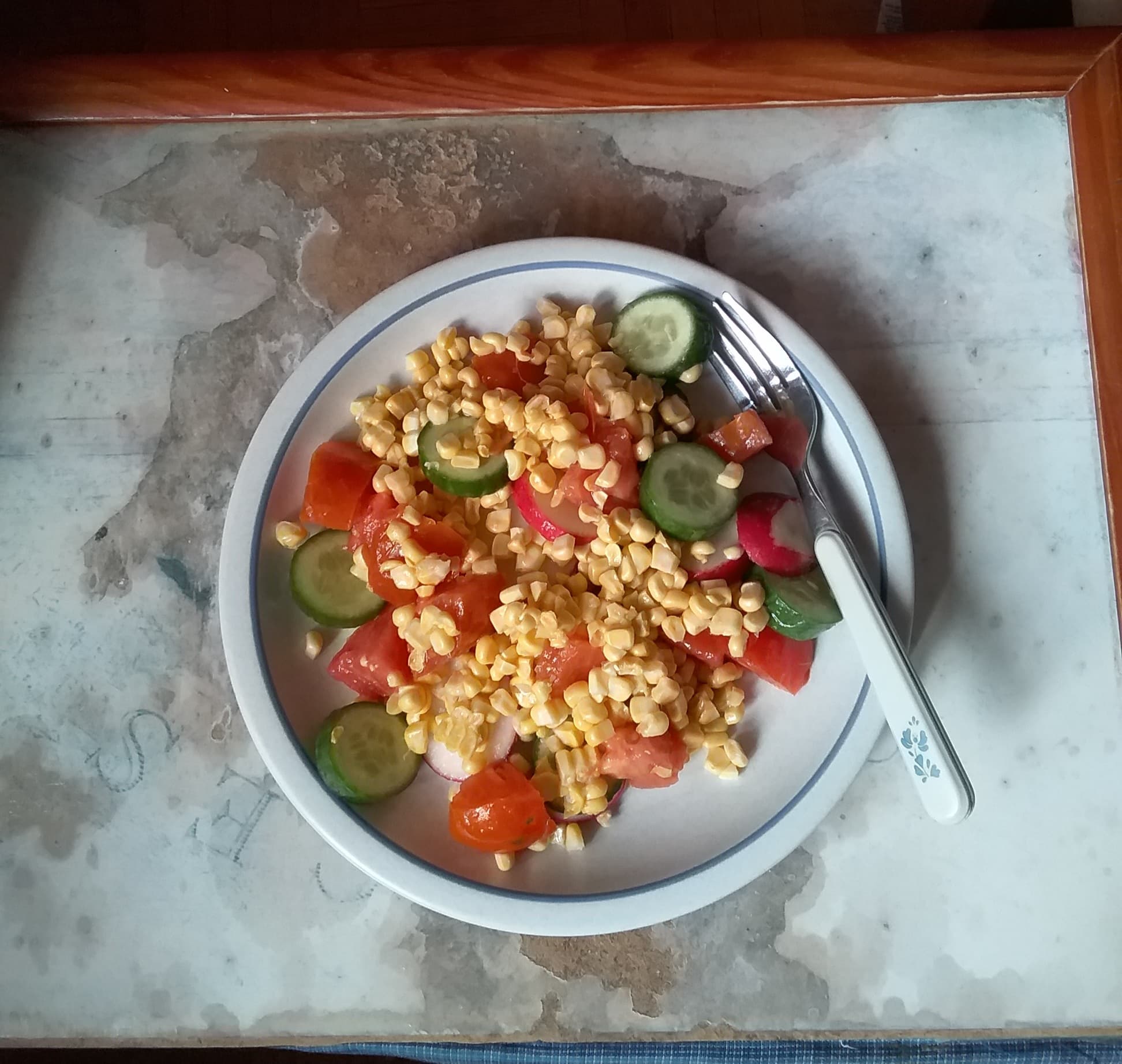 Lunch today was a corn salad with a tomato, radishes and a cuke.