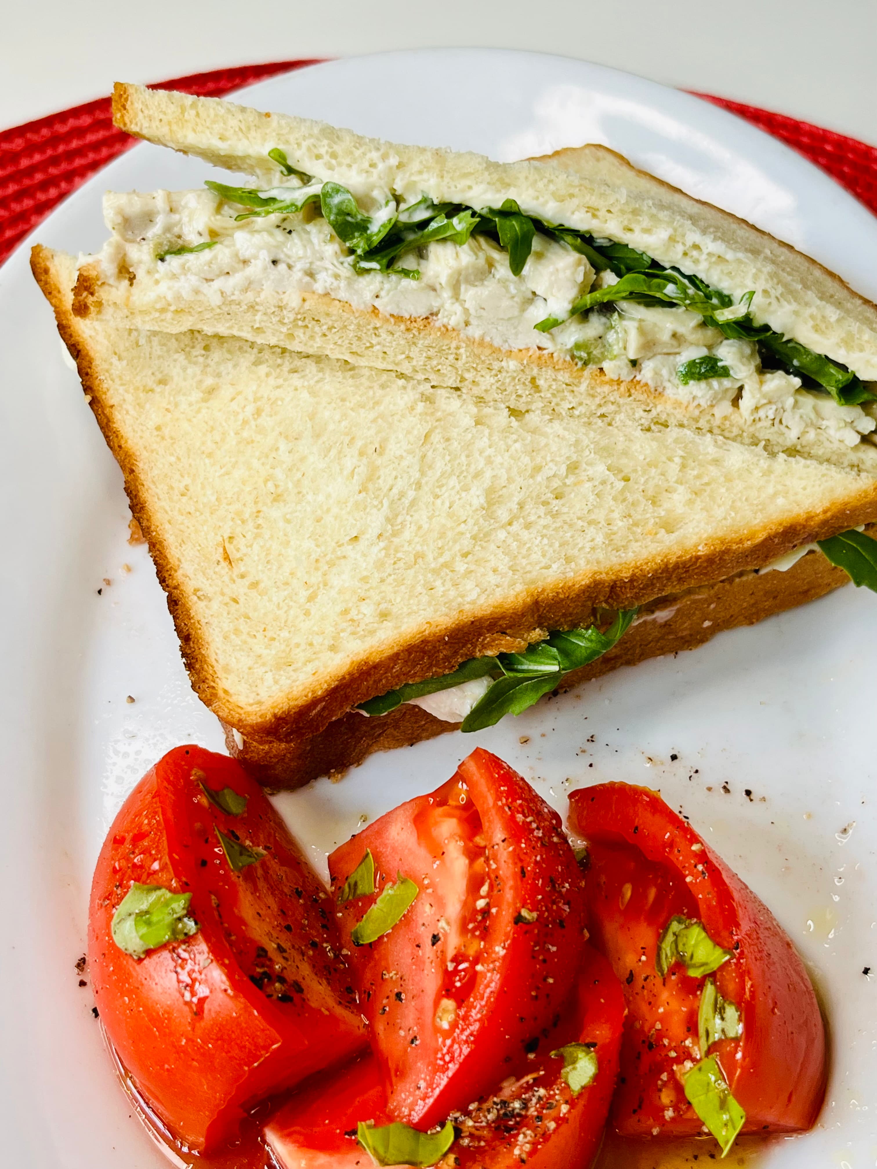 A shredded chicken salad sandwich with capers, olives and arugula. The bread and mayo were made in casa, still getting tomatoes from the FM.