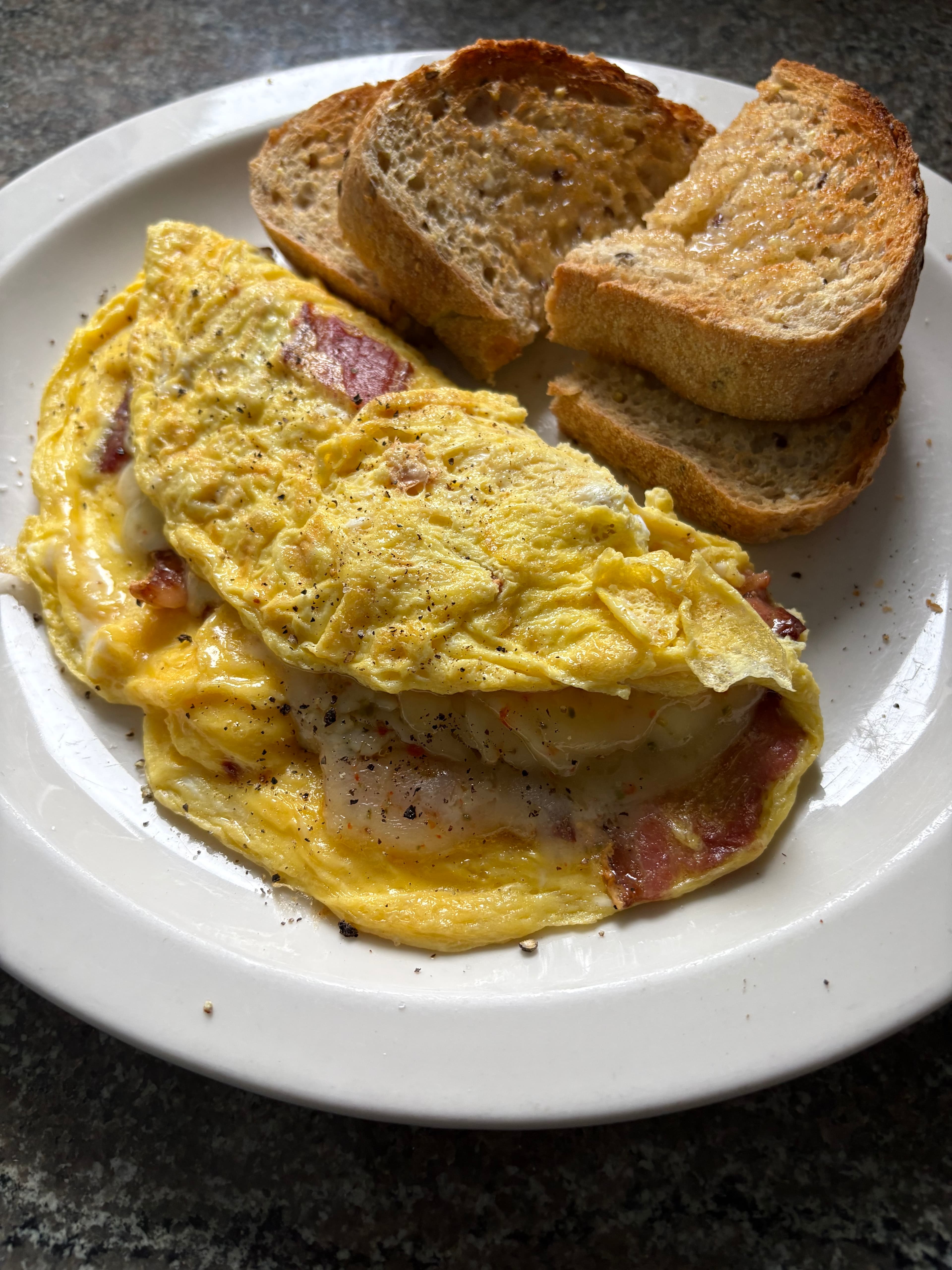Bacon and jalapeno Havarti omelet with a side of multigrain sourdough batard. Quite filling, so dinner might just be some yogurt and fruit.