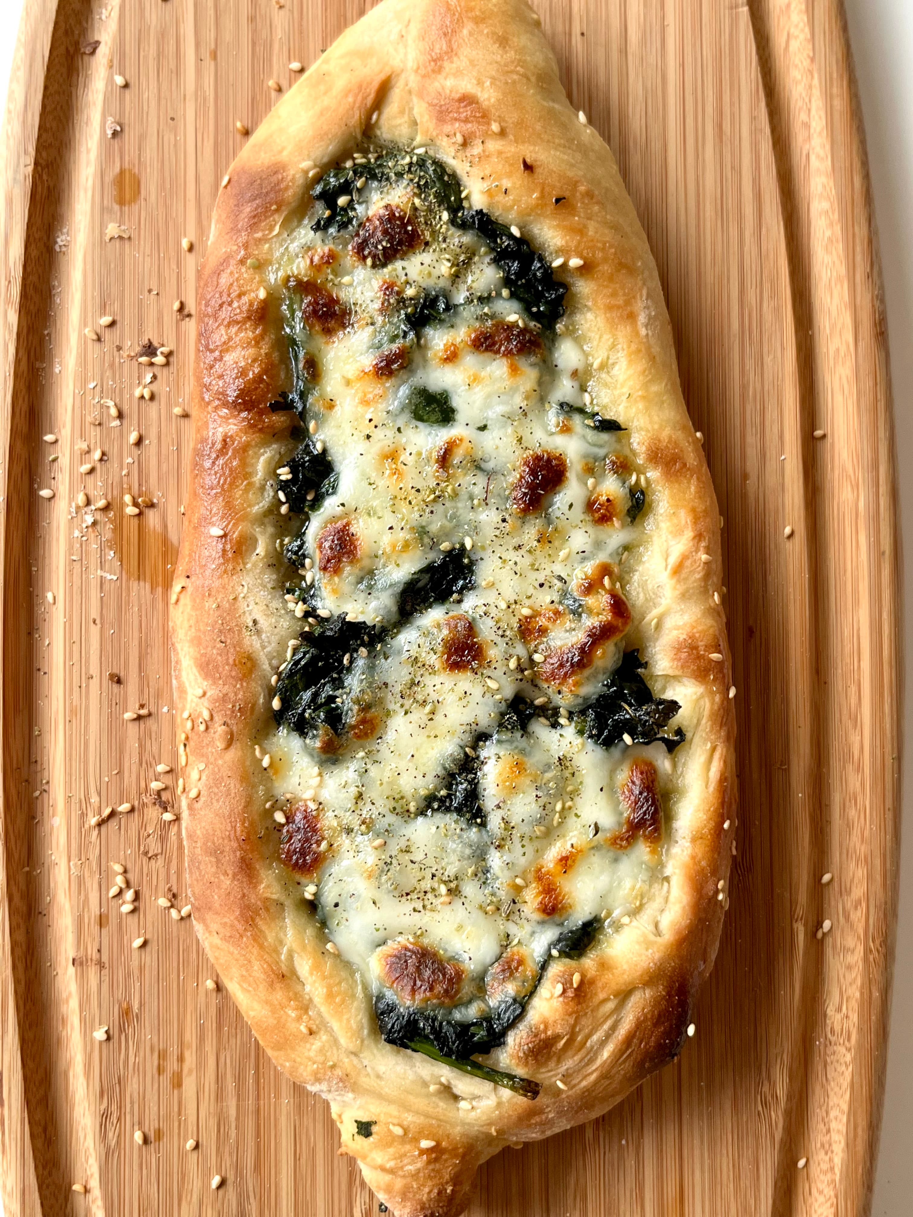 Kinda Katchapuri, a close cousin once removed. This is a simplified version, sautéed large leaf spinach and garlic were the components added to the shaped pizza dough (TJ). Topped with mozzarella, a little evoo and lightly sprinkled with za’atar, made for a very satisfying lunch. Made a salad but saving it for later.