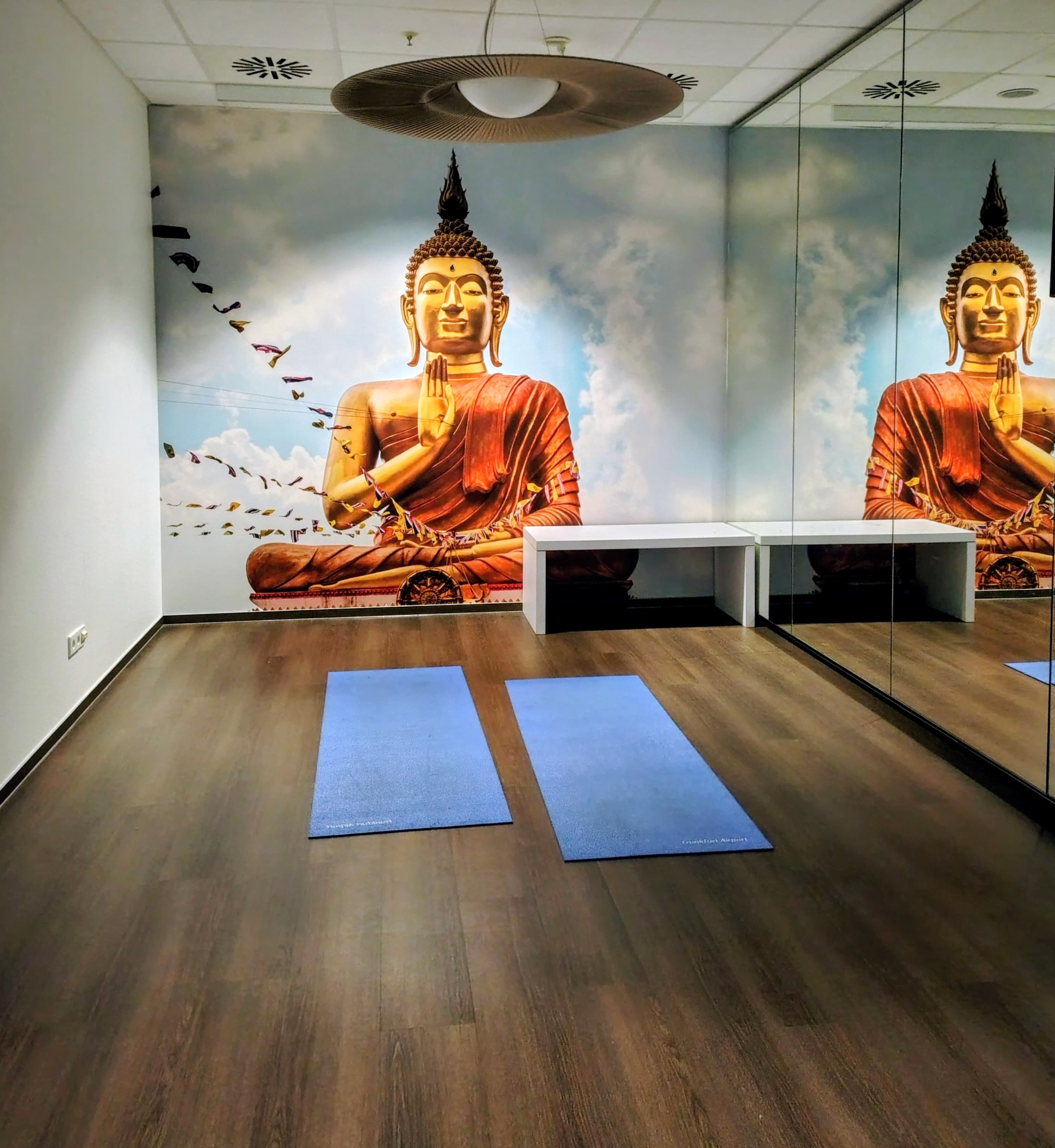 Not bad - the huge Buddha pic is a bit odd as he wasn’t a big yoga enthusiast as far as I know. Pretty good set up for an airport. There were several mats and stuff to clean them with.